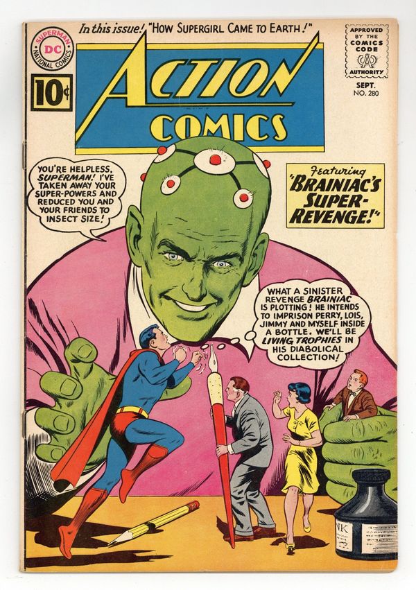 $85.00Cover pencils by Curt Swan, inks by Stan Kaye. "Brainiac's Super-Revenge!", script by Jerry Siegel, pencils by Curt Swan, inks by Stan Kaye; Congorilla helps Superman, Lois and Jimmy escape from Brainiac's trap. One-page Ollie story by Henry Boltinoff. "Trapped In Kandor!", script by Jerry Siegel, art by Jim Mooney; Kandorian scientist Lesla-Lar changes places with a de-powered Supergirl using her teleporter ray and begins her plan to destroy Superman. Superman ad. Batman and Robin ad. 36 Pages, Full Color. $.10 Cover price $0.10.