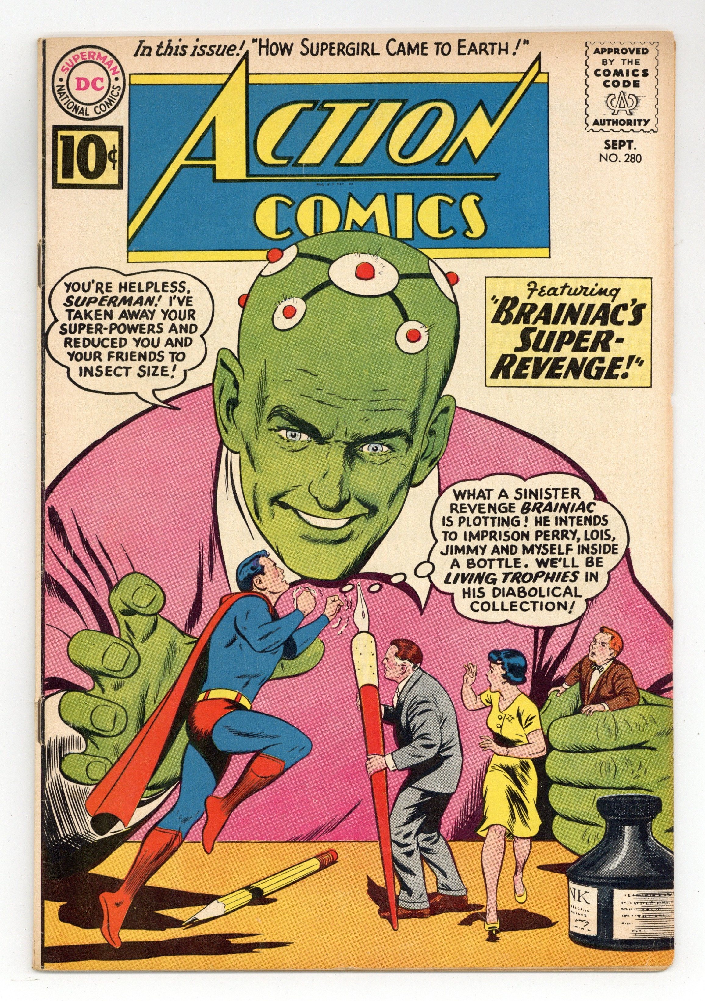 Cover pencils by Curt Swan, inks by Stan Kaye. "Brainiac's Super-Revenge!", script by Jerry Siegel, pencils by Curt Swan, inks by Stan Kaye; Congorilla helps Superman, Lois and Jimmy escape from Brainiac's trap. One-page Ollie story by Henry Boltinoff. "Trapped In Kandor!", script by Jerry Siegel, art by Jim Mooney; Kandorian scientist Lesla-Lar changes places with a de-powered Supergirl using her teleporter ray and begins her plan to destroy Superman. Superman ad. Batman and Robin ad. 36 Pages, Full Color. $.10 Cover price $0.10.