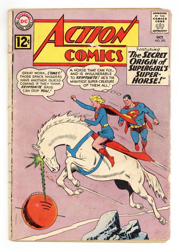 Cover pencils by Curt Swan, inks by George Klein. "The Feud Between Superman and Clark Kent!", script by Edmond Hamilton, art by Al Plastino; Red Kryptonite causes Clark and Superman to be split into two separate beings, but Superman tries to take steps to prevent them from being reunited when the effect wears off. Ad for the Atom. One-page Private Pete story by Henry Boltinoff. "The Secret Origin of Supergirl's Super-Horse!", script by Leo Dorfman, art by Jim Mooney; Comet telepathically tells Supergirl how he was originally human, and loved by the sorceress Circe, until a jealous rival caused him to be changed into a horse. 36 Pages, Full Color. $0.12 Cover price $0.12.