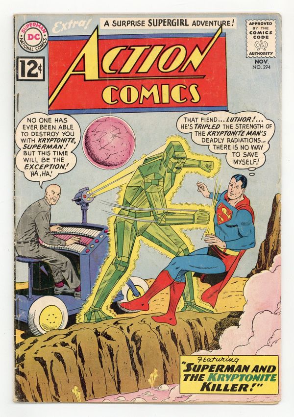 Cover pencils by Curt Swan, inks by George Klein. "The Kryptonite Killer!", script by Edmond Hamilton, art by Al Plastino; Luthor escapes from his imprisonment on the planet Roxar with the help of three enhanced androids, then goes on an interplanetary crime spree. Batman ad. Joker-Luthor Incorporated! ad. One-page Jerry the Jitterbug story by Henry Boltinoff. Supermen of America ad. "The Mutiny of Super-Horse!", script by Leo Dorfman, art by Jim Mooney; Supergirl thinks that Comet prefers movie star Liz Gaynor, his co-star in a new adventure film, but Superman discovers that Comet now has amnesia and doesn't remember Supergirl, or even that he has super-powers. 36 Pages, Full Color. $0.12 Cover price $0.12.