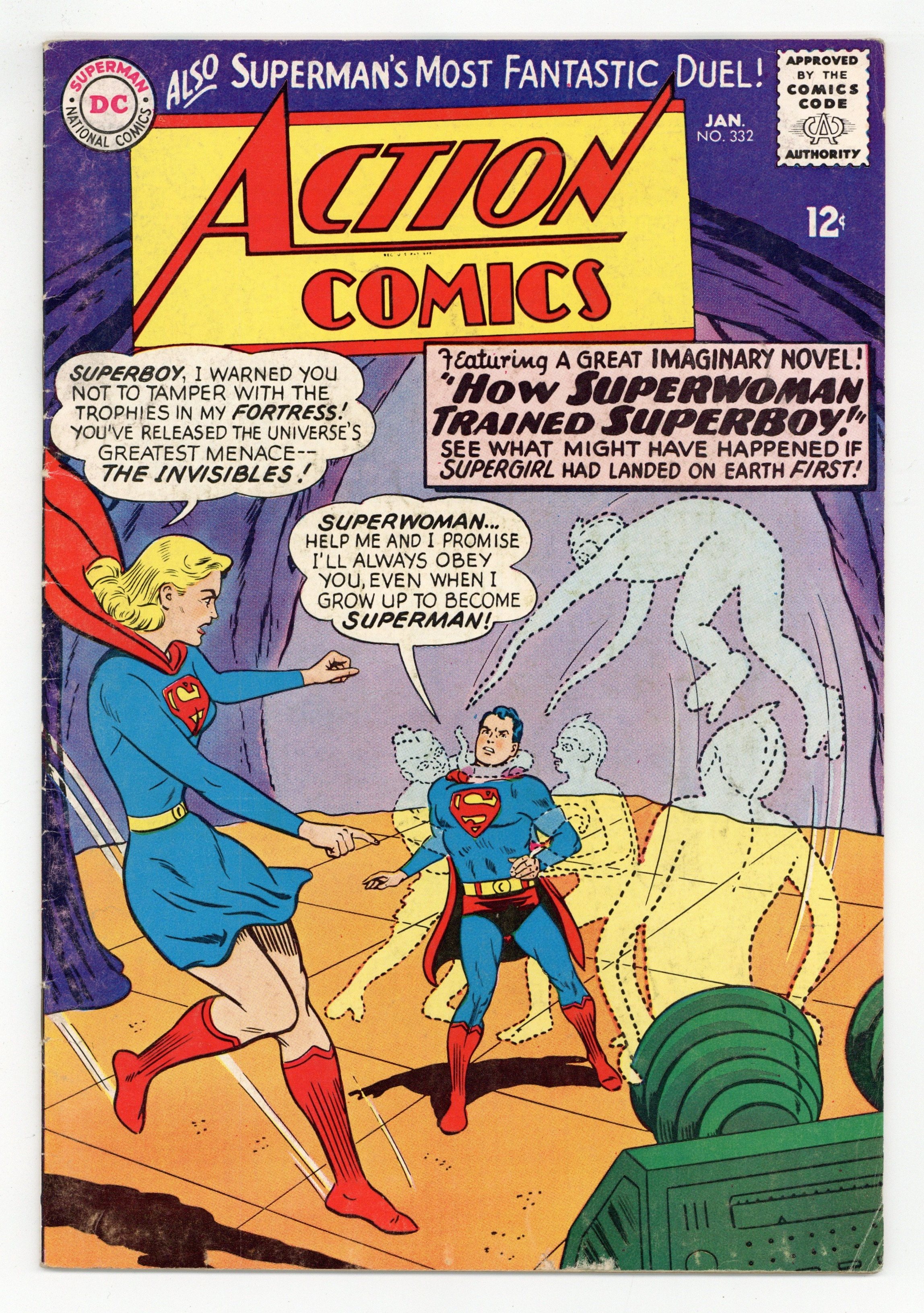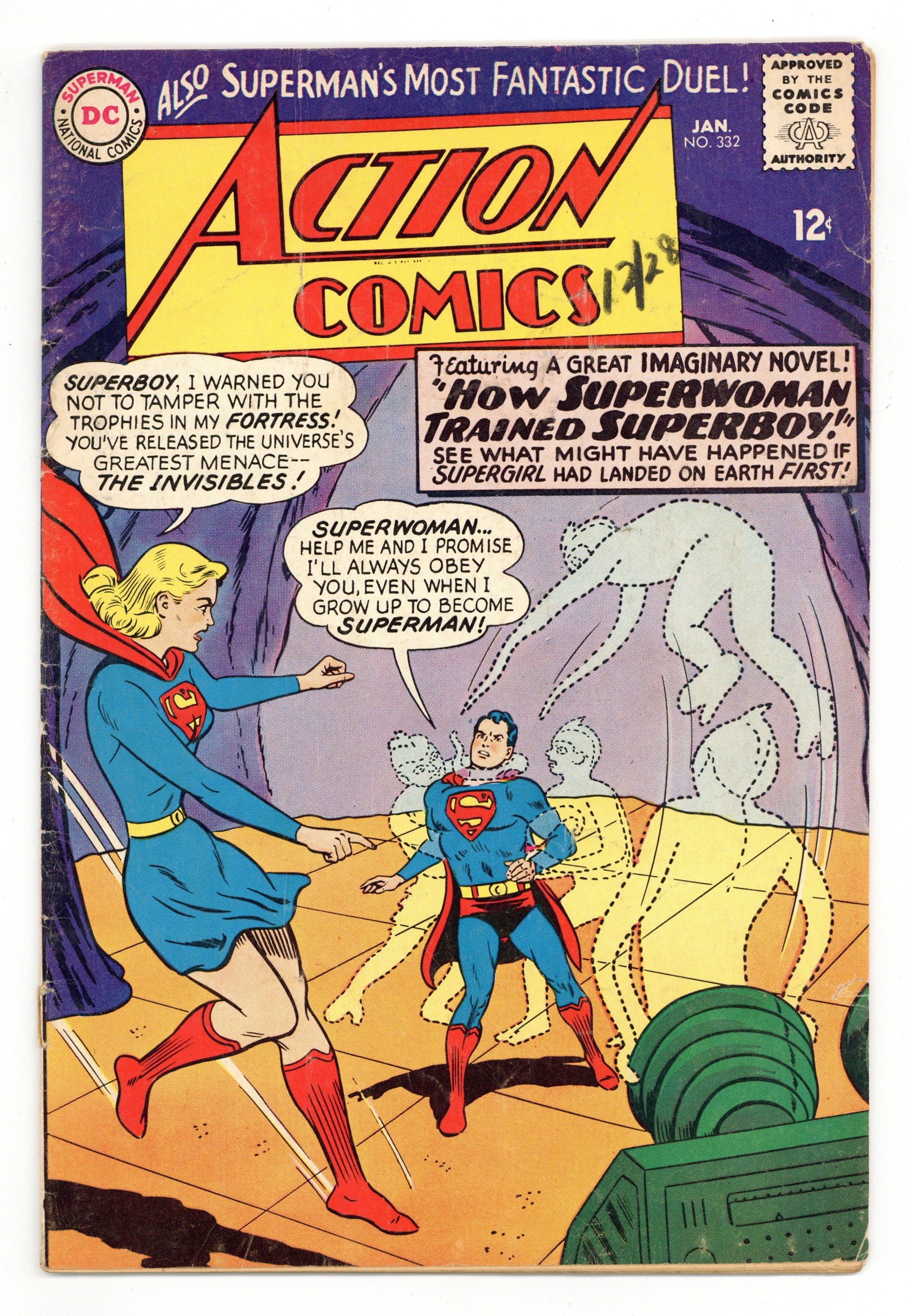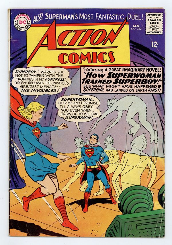 Cover pencils by Curt Swan, inks by Sheldon Moldoff. "The Super-Revenge of Lex Luthor!", script by Leo Dorfman, art by Al Plastino; Luthor escapes from his asteroid prison and seeks revenge on Superman, because Superman has revealed to Lex's wife Ardora that Luthor is a criminal. Superman ad. Batman ad. Supergirl stars in an imaginary story, "How Superwoman Trained Superboy!", script by Leo Dorfman, art by Jim Mooney; On Krypton, Zor-El discovers that the planet is doomed, and he and his family travel to Earth, where they gain super-powers; Not long after, Gold Kryptonite takes away the powers of Zor-El and Allura, and they train their young daughter Kara to grow into a super-heroine. Superman ad. Teen Titans ad. Rocky and Bullwinkle star in a one-page Cheerios ad. 36 Pages, Full Color. $0.12 Cover price $0.12.