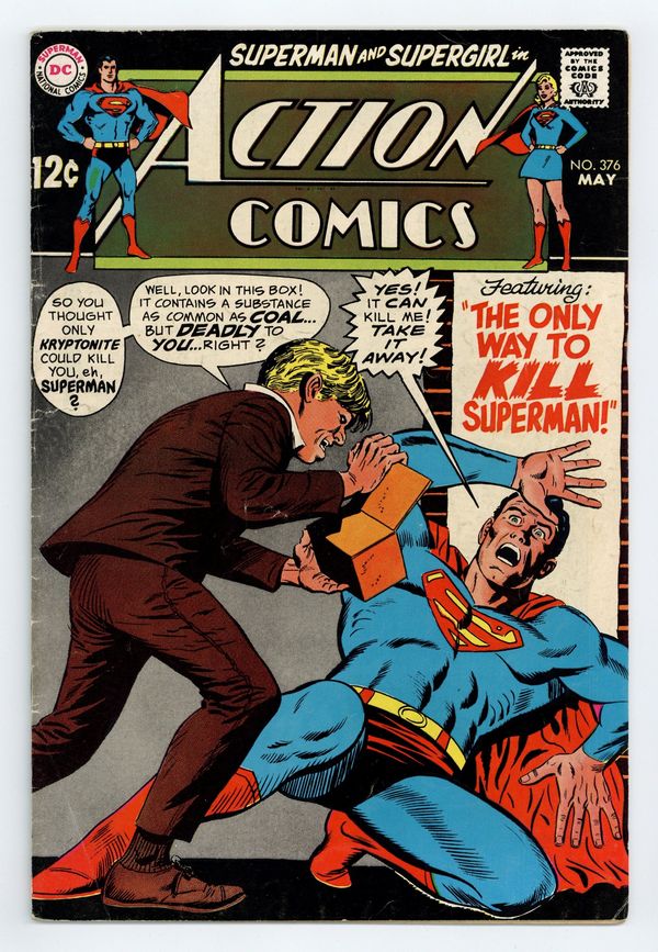 Last 12-cent cover price. Cover pencils by Curt Swan, inks by Mike Esposito. "The Only Way to Kill Superman!", script by Otto Binder, pencils by Curt Swan, inks by Jack Abel; The Anti-Superman Gang tries several different scientific weapons against Superman until one left him caught in a Kryptonite trap. Superboy ad. Hawkman ad. Nightmaster ad. Last Supergirl story in Action Comics, "The Hated Girl of Steel," art by Kurt Schaffenberger; Scientists attending a conference at Stanhope College are kidnapped by aliens from the planet Rancor who want to steak their collective knowledge; Supergirl learns that they were also responsible for the blinding of Dr. Alexander. Legion of Super-Heroes ad. One-page "DC Stars of Stage, Screen, Radio, and Television" article on media adaptations of Superman, Batman, and other DC characters. 36 Pages, Full Color. $0.12 Cover price $0.12.
