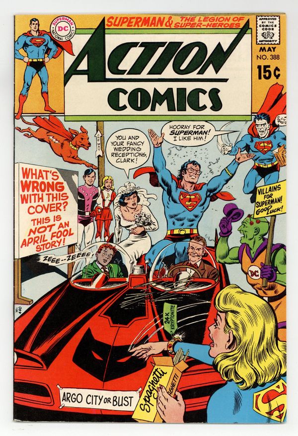 $19.75Cover pencils by Curt Swan, inks by Murphy Anderson. "Puzzle of the Wild World," script by Cary Bates, pencils by Curt Swan, inks by George Roussos; Professor Farlow Nurd's world-duplicator machine causes a wacky version of the Earth to replace Superman's Earth. Tales of the Legion of Super-Heroes backup, "Sun-Boy's Lost Power!", script by Jerry Siegel, art by John Forte; Sun Boy loses his powers and has to find a way to recharge them. 36 Pages, Full Color. $0.15 Cover price $0.15.