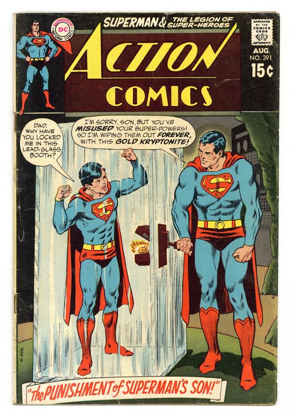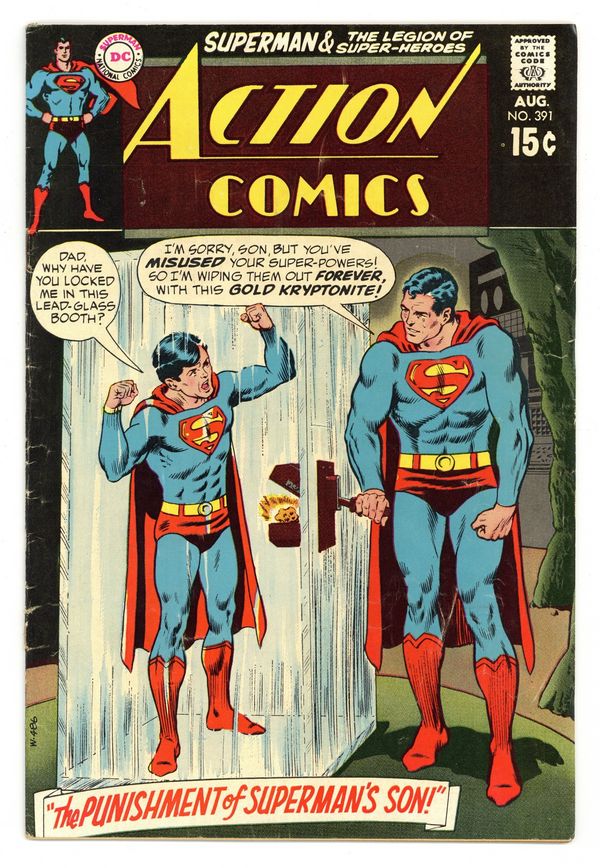 Cover pencils by Curt Swan, inks by Murphy Anderson. Batman's Son, Superman's Son & Wife, and the Bottle City of Kandor appear in "The Punishment of Superman's Son!", script by Robert Kanigher, pencils by Ross Andru, inks by Mike Esposito; Superman, Jr. continually messes up with his super powers until finally Superman decides he must use Gold Kryptonite to remove Superman Jr's powers. Letter to the editor from comics writer Martin Pasko. Tales of the Legion of Super-Heroes back-up, "The Ordeal of Element Lad!", script by E. Nelson Bridwell, pencils by Win Mortimer, inks by Jack Abel; The Legionnaires help the rebels overthrow the president and turn the rebels against Masrin; Appearances by Chameleon Boy, Braniac-5, Timber Wolf, Element Lad, Saturn Girl, and the Karate Kid. 36 Pages, Full Color. $0.15 Cover price $0.15.