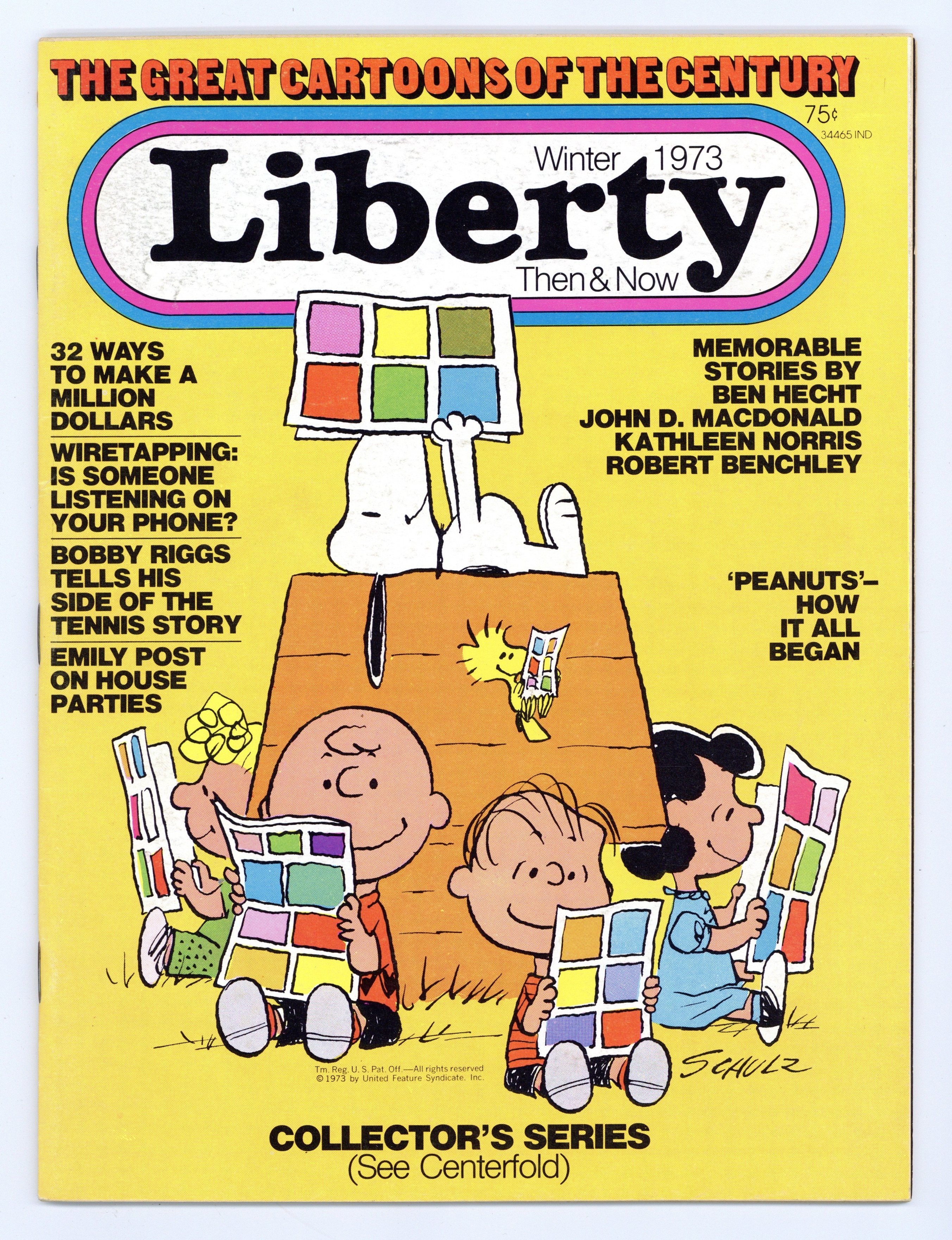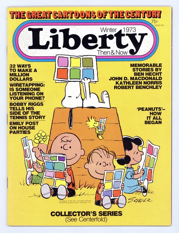 Published Oct 1973 by Liberty Magazine.$2.65Winter 1973. Cover by Charles Schulz. "Peanuts - How It All Began" by Charles Schultz article. "Great Cartoonists of the Century" by David Folkman features Richard Outcalt, Frederic Opper, Winsor McKay, George Herriman, George McManus, Frank King, Harold Gray, Hal Foster, Roy Crane, Chic Young, Chester Gould, Alex Raymond, Al Capp, Milton Caniff, Mort Walker, Johnny Hart plus a section on editorial cartoonists with a short bio and samples of their work. Full color original centerfold of comic characters by Arnold Genkins. Fiction by John D. MacDonald, Ben Hecht and Kathleen Norris. 8 1/4-in. x 11-in., 80 pages, B&W. Cover price $0.75.