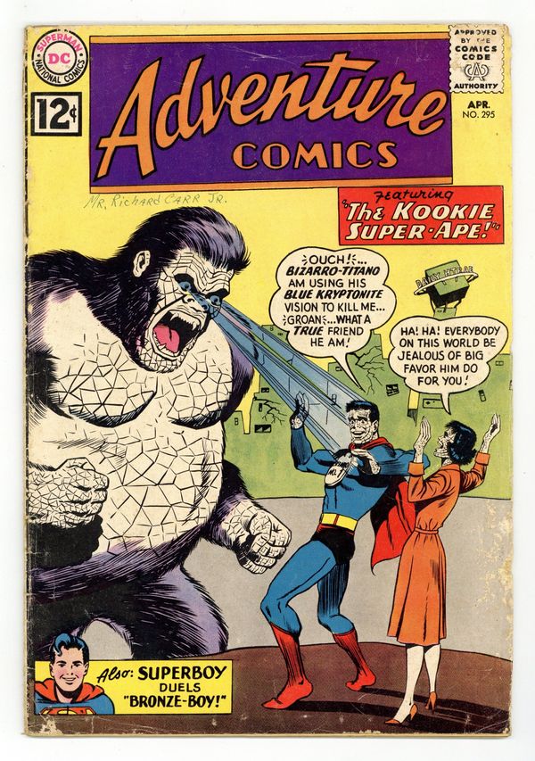 The Duel of the Superboys!, script by Bill Finger, art by George Papp. Peg humor page by Henry Boltinoff. The Kookie Super-Ape--Tales of the Bizarro World, script by Jerry Siegel, art by John Forte; Bizzaro-Titano wrestles Bizzaro-Lois; 1st Bizarro Titano. Varsity Vic humor page by Henry Boltinoff. 36 pages, Full Color. Cover price $0.12.
