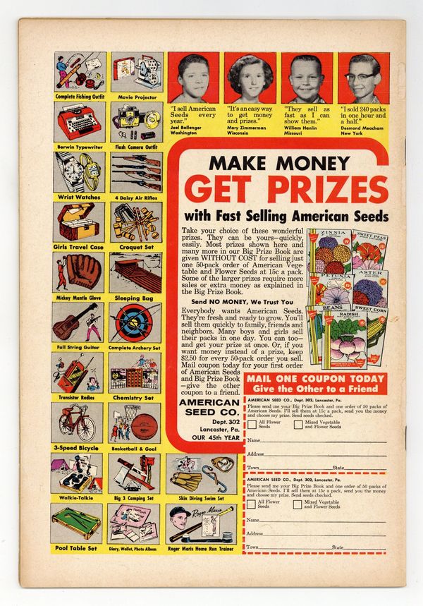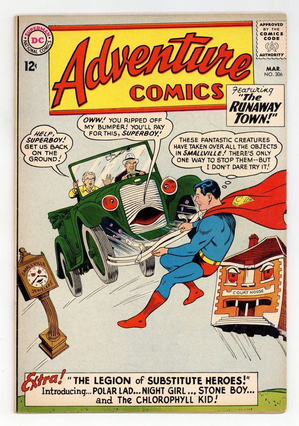 Cover pencils by Curt Swan, inks by George Klein. The 5th Dimensional High-School! starring Superboy, script by Otto Binder, art by George Papp; Mxyzptlk plays pranks on Smallville in order to do well in his 5th dimensional practical joking class. The Legion of Substitute Heroes--Tales of the Legion of Super-Heroes, script by Edmond Hamilton, art by John Forte; A group of rejected applicants band together as the Legion of Substitute Heroes and thwart the Plant Men's scheme to take over the Earth; First appearances of Polar Lad, Night Girl, Stone Boy, and the Chlorophyll Kid. 36 pages, Full Color. Cover price $0.12.