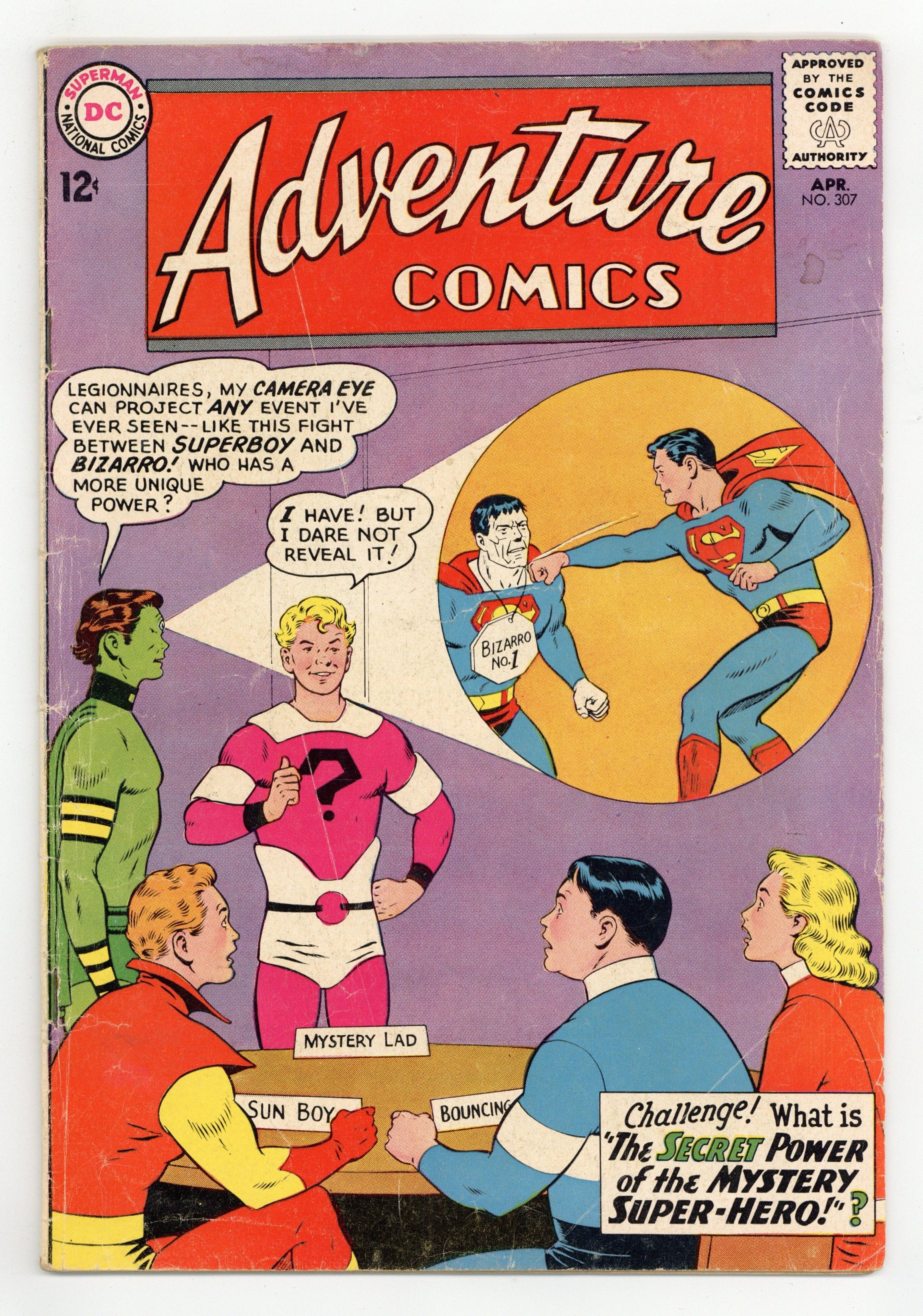 Cover pencils by Curt Swan, inks by George Klein. The Confession of Superboy!, art by George Papp; Lana tries to prove Clark is Superboy. The Secret Power of the Mystery Super-Hero!--Tales of the Legion of Super-Heroes, script by Edmond Hamilton, art by John Forte; The Legion takes in new member Mystery Lad on Saturn Girl's word and he helps them put an end to space pirate Roxxas; 1st appearance of Element Lad. Casey the Cop humor half-page by Henry Boltinoff. 36 pages, Full Color. Cover price $0.12.