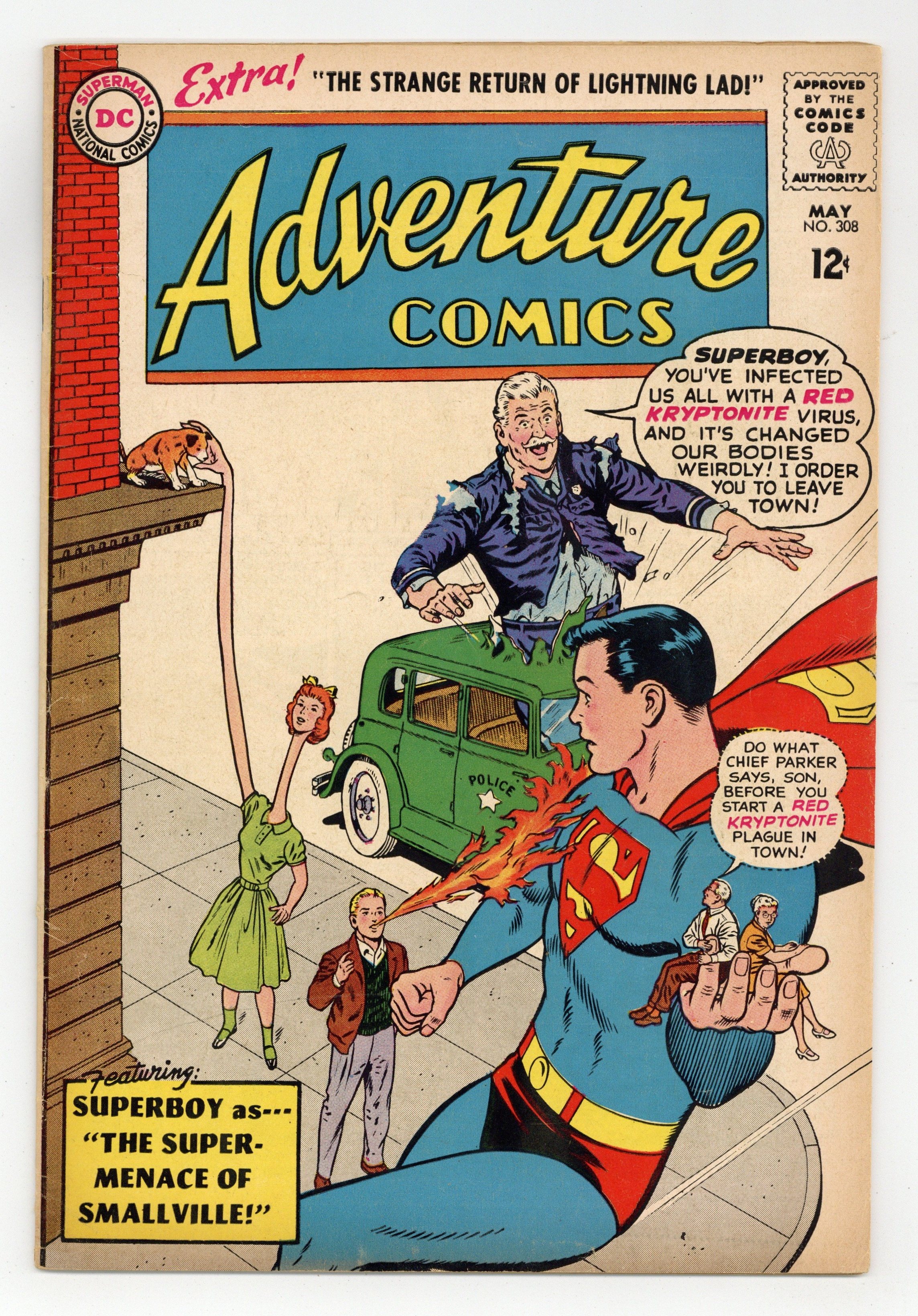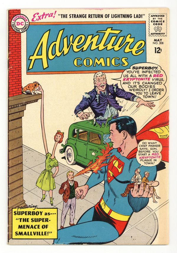 Cover pencils by Curt Swan, inks by George Klein. The Super-Menace of Smallville! starring Superboy, art by George Papp; Luthor plagues Smallville with a Red Kryptonite plague. Tricksy humor half-page by Henry Boltinoff. The Return of Lightning Lad!--Tales of the Legion of Super-Heroes, script by Edmond Hamilton, art by John Forte; Lightning Lad's sister impersonates her dead brother and joins the Legion; 1st appearance of Lightning Lass. 36 pages, Full Color. Cover price $0.12.