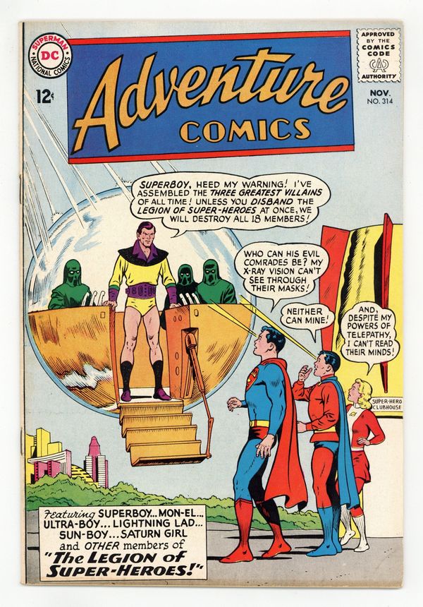 Cover pencils by Curt Swan, inks by George Klein. Part I: The Super-Villains of All Ages!--Tales of the Legion of Super-Heroes, script by Edmond Hamilton, art by John Forte; Rejected Legion applicant Alaktor steals a Time Bubble and recruits the help of Nero, Dillinger, and Hitler. Part 2: The Civil War of the Legion!--Tales of the Legion of Super-Heroes, script by Edmond Hamilton, art by John Forte; Alaktor switches Hitler's, Nero's, and Dillinger's minds with Superboy's, Mon-El's, and Ultra-Boy's. My Son, the Boy of Steel, art by George Papp; Fred Carter thinks his son Amos is Superboy. 36 pages, Full Color. Cover price $0.12.