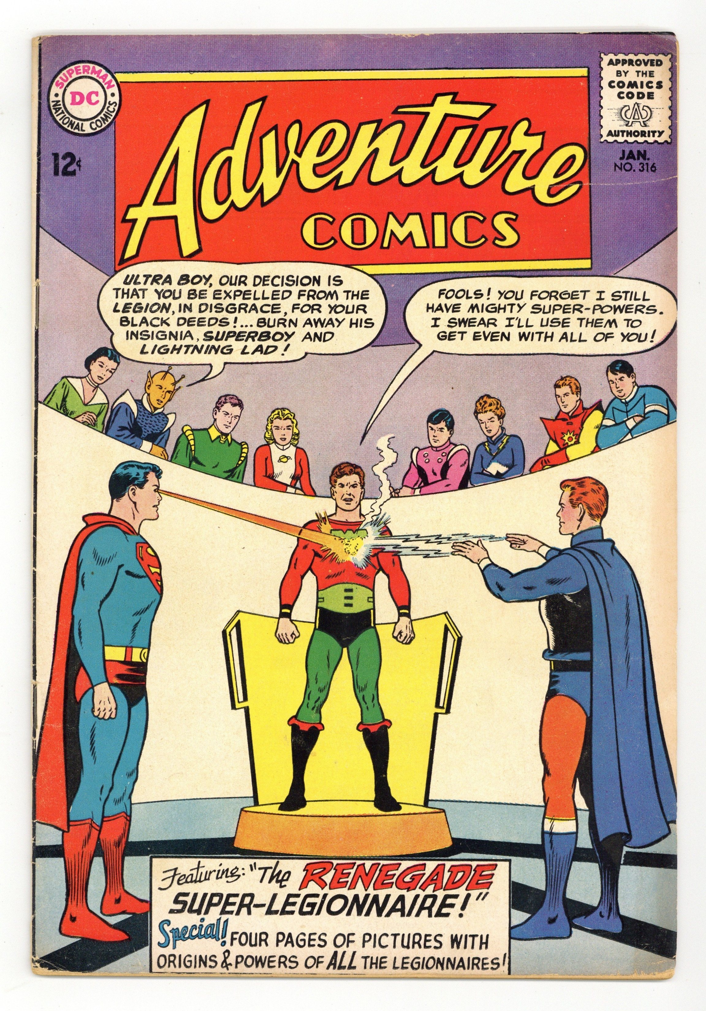 Cover pencils by Curt Swan, inks by George Klein. Part I: The Renegade Super-Hero!--Tales of the Legion of Super-Heroes, script by Edmond Hamilton, art John Forte; When Ultra Boy appears to be an escaped convict, he is expelled from the Legion and has to flee the planet. Part II: The End of a Super-Traitor!--Tales of the Legion of Super-Heroes, script by Edmond Hamilton, art by John Forte; Ultra Boy reveals that his faked criminal past was a ploy to infiltrate and lure a pirate band into custody. The Origins and Powers of the Legion of Super-Heroes! illustrations, pencils by Curt Swan, inks by George Klein. 36 pages, Full Color. Cover price $0.12.