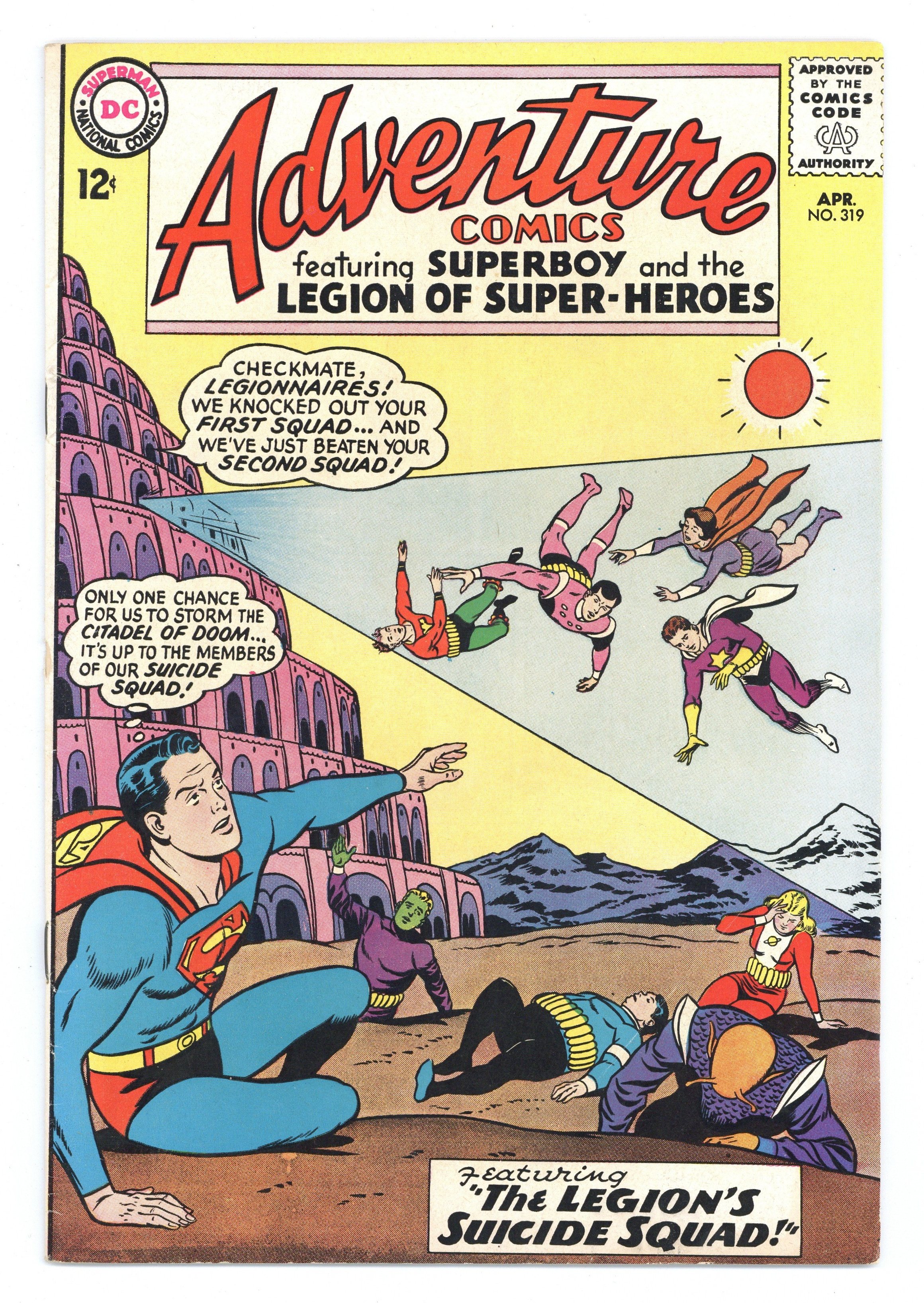 Cover pencils by Curt Swan, inks by Sheldon Moldoff. Part I: The Legion's Suicide Squad!--Tales of the Legion of Super-Heroes, script by Edmond Hamilton, art by John Forte; Isolationist planet Throon builds a citadel to keep others away and uses a ray to disable all passing spaceships. Part II: The Charge of the Substitute Heroes!--Tales of the Legion of Super-Heroes; The next two teams of Legionnaires also fail, but the Subs are able to put an end to the menace of Throon. Superboy's Best Friend, script by Robert Bernstein, art by George Papp; Freddy Shaw becomes Clark Kent's best friend and is let in on his secret identity as Superboy. 36 pages, Full Color. Cover price $0.12.