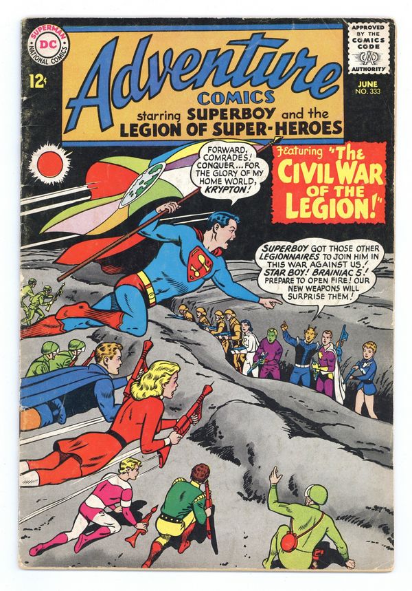 $15.75Cover pencils by Curt Swan, inks by George Klein. Happy Hobby Time! public service announcement starring Superboy, script by Jack Schiff, art by Winslow Mortimer. The War Between Krypton and Earth!--Tales of the Legion of Super-Heroes, script by Edmond Hamilton, pencils by John Forte, inks by George Klein; The Legionnaires travel to the past to find out the story behind an ancient artifact which refers to a war between Earth and Krypton. The Spoiled Superboy, art by Al Plastino. Superboy also stars in a one-page public service announcement, Happy Hobby Time! Rocky and Bullwinkle star in a one-page Cheerios ad. 36 Pages, Full Color. Cover price $0.12.