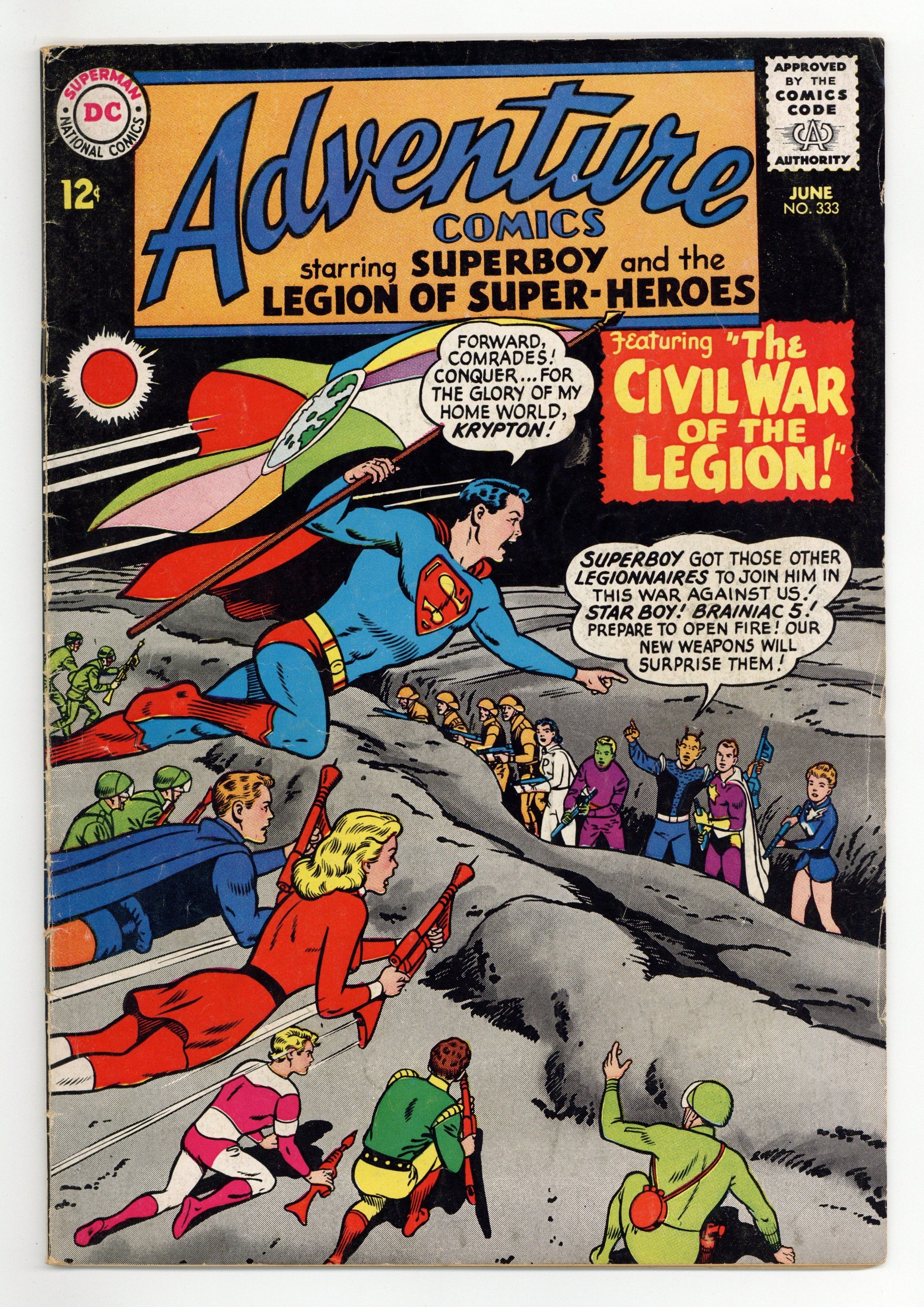 Cover pencils by Curt Swan, inks by George Klein. Happy Hobby Time! public service announcement starring Superboy, script by Jack Schiff, art by Winslow Mortimer. The War Between Krypton and Earth!--Tales of the Legion of Super-Heroes, script by Edmond Hamilton, pencils by John Forte, inks by George Klein; The Legionnaires travel to the past to find out the story behind an ancient artifact which refers to a war between Earth and Krypton. The Spoiled Superboy, art by Al Plastino. Superboy also stars in a one-page public service announcement, Happy Hobby Time! Rocky and Bullwinkle star in a one-page Cheerios ad. 36 Pages, Full Color. Cover price $0.12.