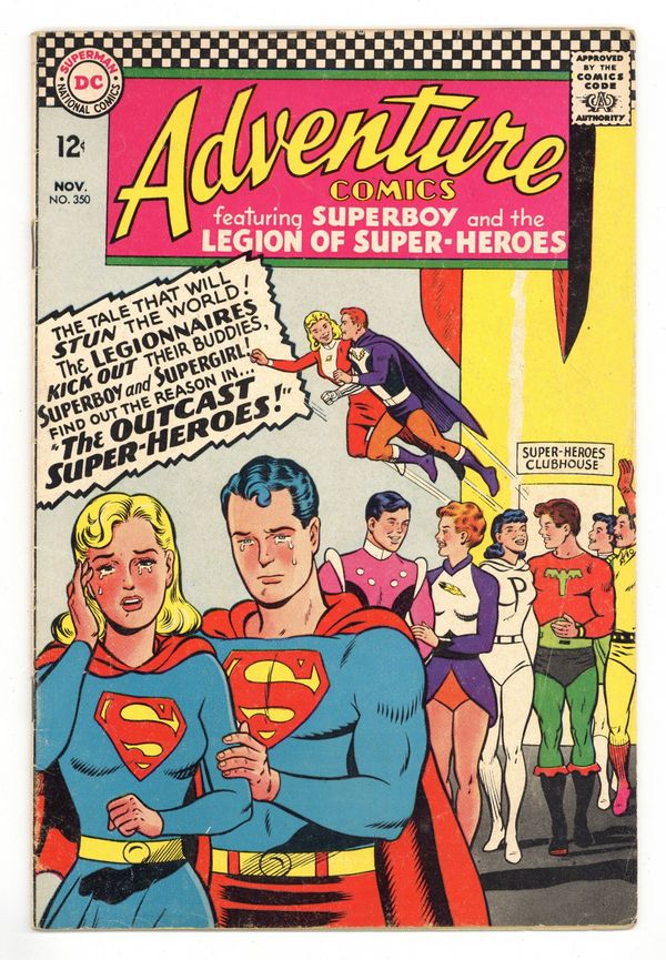 Cover pencils by Curt Swan, inks by George Klein. The Outcast Super-Heroes!--Tales of the Legion of Super-Heroes, script by E. Nelson Bridwell, pencils by Curt Swan, inks by George Klein; Superboy and Supergirl resign due to a Kryptonite cloud, and are replaced by Sir Prize and Miss Terious who help fight the Devil's Dozen. The Origin of Chameleon Boy text article. 36 Pages, Full Color. Cover price $0.12.