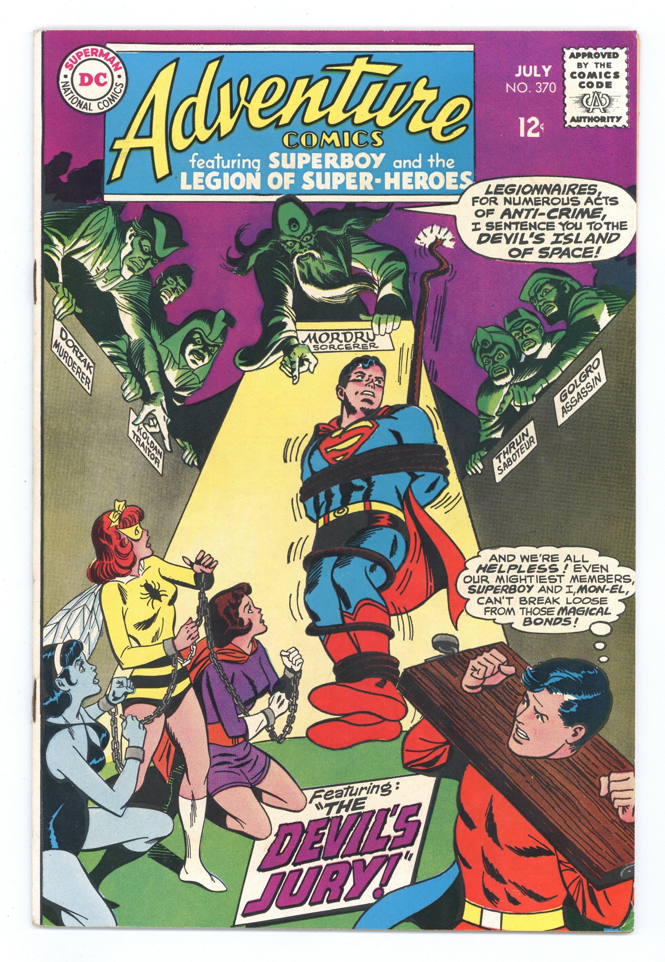 Cover pencils by Curt Swan, inks by Jack Abel. The Devil's Jury!--Tales of the Legion of Super-Heroes, script by Jim Shooter, pencils by Jim Shooter (layouts only) and Curt Swan, inks by Jack Abel; The Legionnaires escape Mordru and wipe their memories of being Legionnaires; Mordru isolates Smallville and sends an army to flush them out, but it takes Pete Ross to restore Superboy's memory; Mordru captures and convicts the Legionnaires in a kangaroo court, but with the aid of the prosecutor, they escape, and Mordru is buried once again. 36 Pages, Full Color. Cover price $0.12.