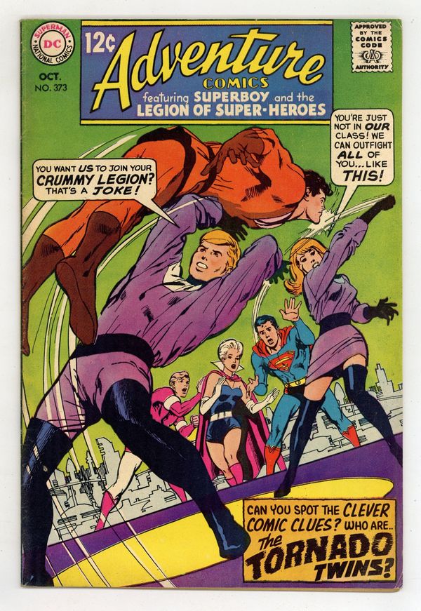 Cover art by Neal Adams. Intro of the Tornado Twins in The Tornado Twins!--Tales of the Legion of Super-Heroes, script by Jim Shooter, pencils by Jim Shooter (layouts only) and Win Mortimer, inks by Win Mortimer; The Tornado Twins use their super-speed powers to upstage the Legion, but it was only a publicity stunt for Flash Day. 36 Pages, Full Color. Cover price $0.12.