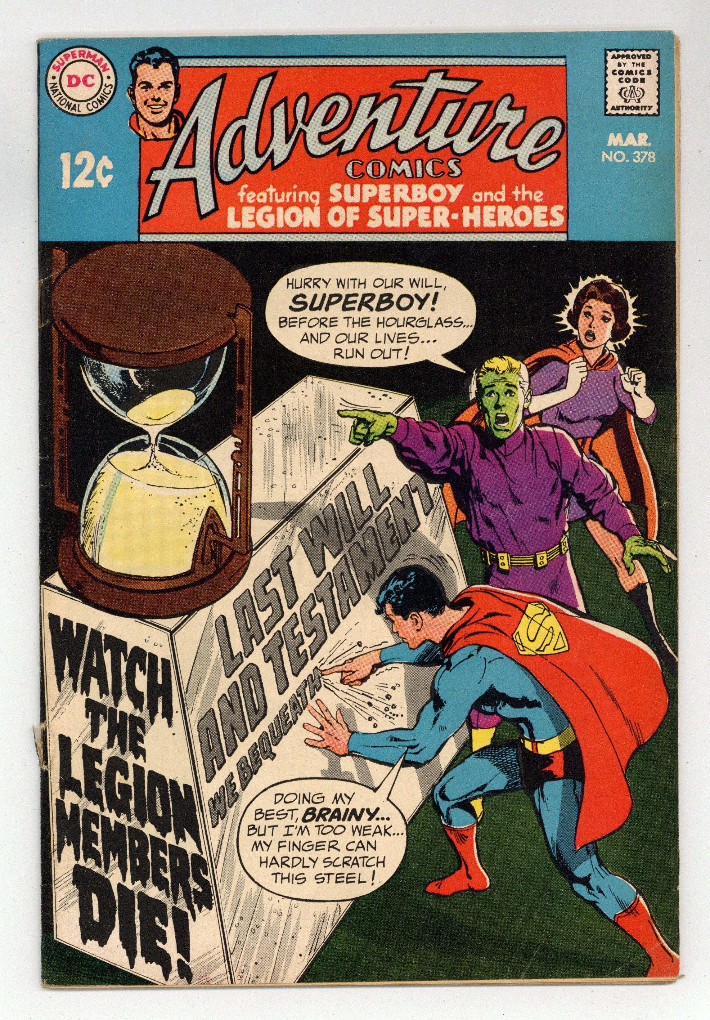 Cover pencils by Curt Swan, inks by Neal Adams. Twelve Hours to Live!--Tales of the Legion of Super-Heroes, script by Jim Shooter, pencils by Jim Shooter (layouts only) and Win Mortimer, inks by Jack Abel; During a celebration of Brainiac 5's birthday, several Legionnaires are poisoned. While Superboy and Duo Damsel struggle with telling their parents, Karate Kid heads out on a suicide mission in search of the Fatal Five; Karate Kid disrupts their plans, then returns to Legion headquarters, where all the Legionnaires seemingly drop dead. 36 Pages, Full Color. Cover price $0.12.