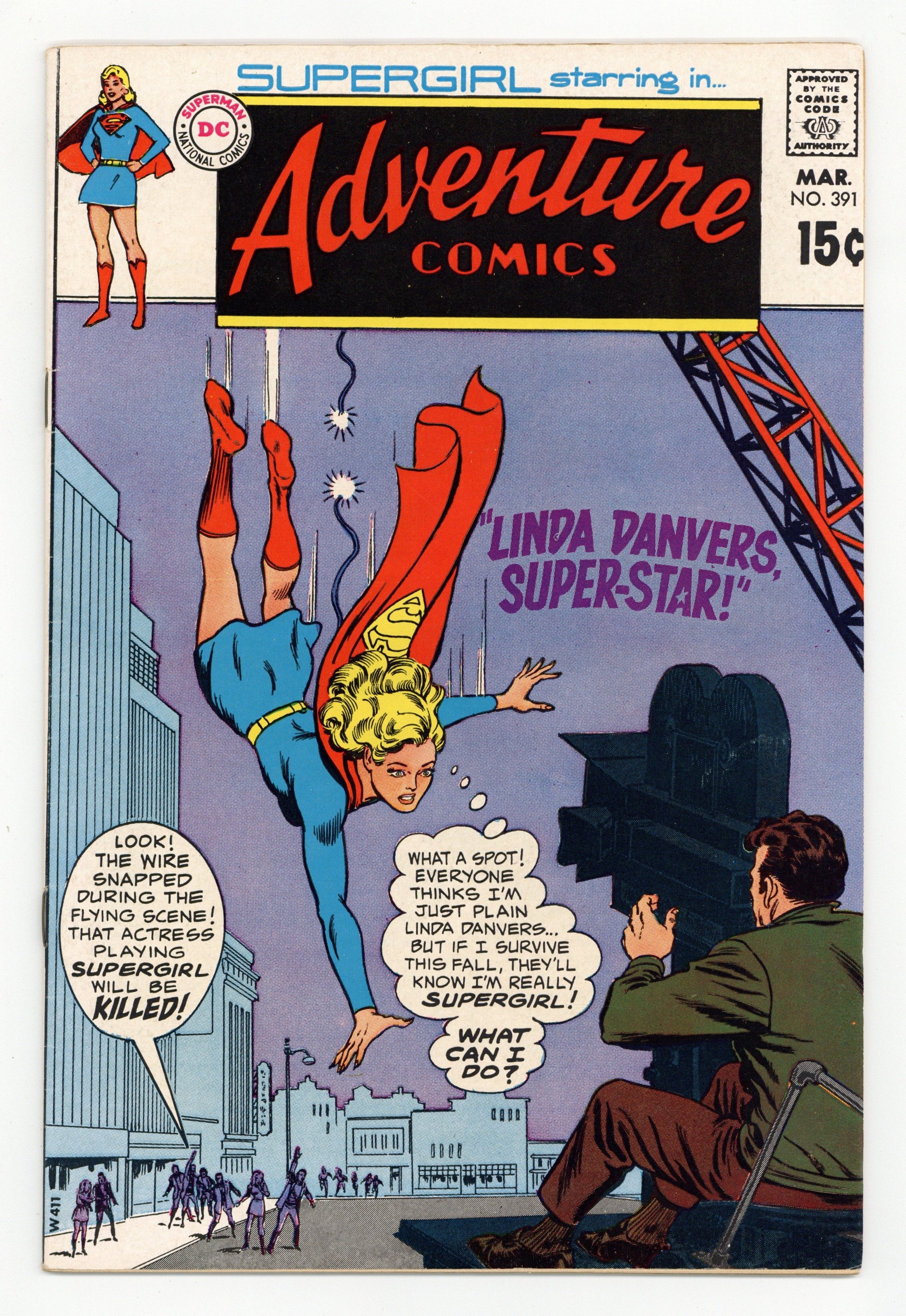 Cover pencils by Curt Swan, inks by Murphy Anderson. Linda Danvers, Super-Star! starring Supergirl, John Harris, Professor Vizhago, Albert Ames, Jan Butler, Eve Emerson, and Vic Tane, script by Robert Kanigher, art by Kurt Schaffenberger; in her acting job, Linda Danvers plays Supergirl. The Super-Exchange Student! starring Supergirl, script by Cary Bates, pencils by Win Mortimer, inks by Jack Abel. 36 Pages, Full Color. Cover price $0.15.