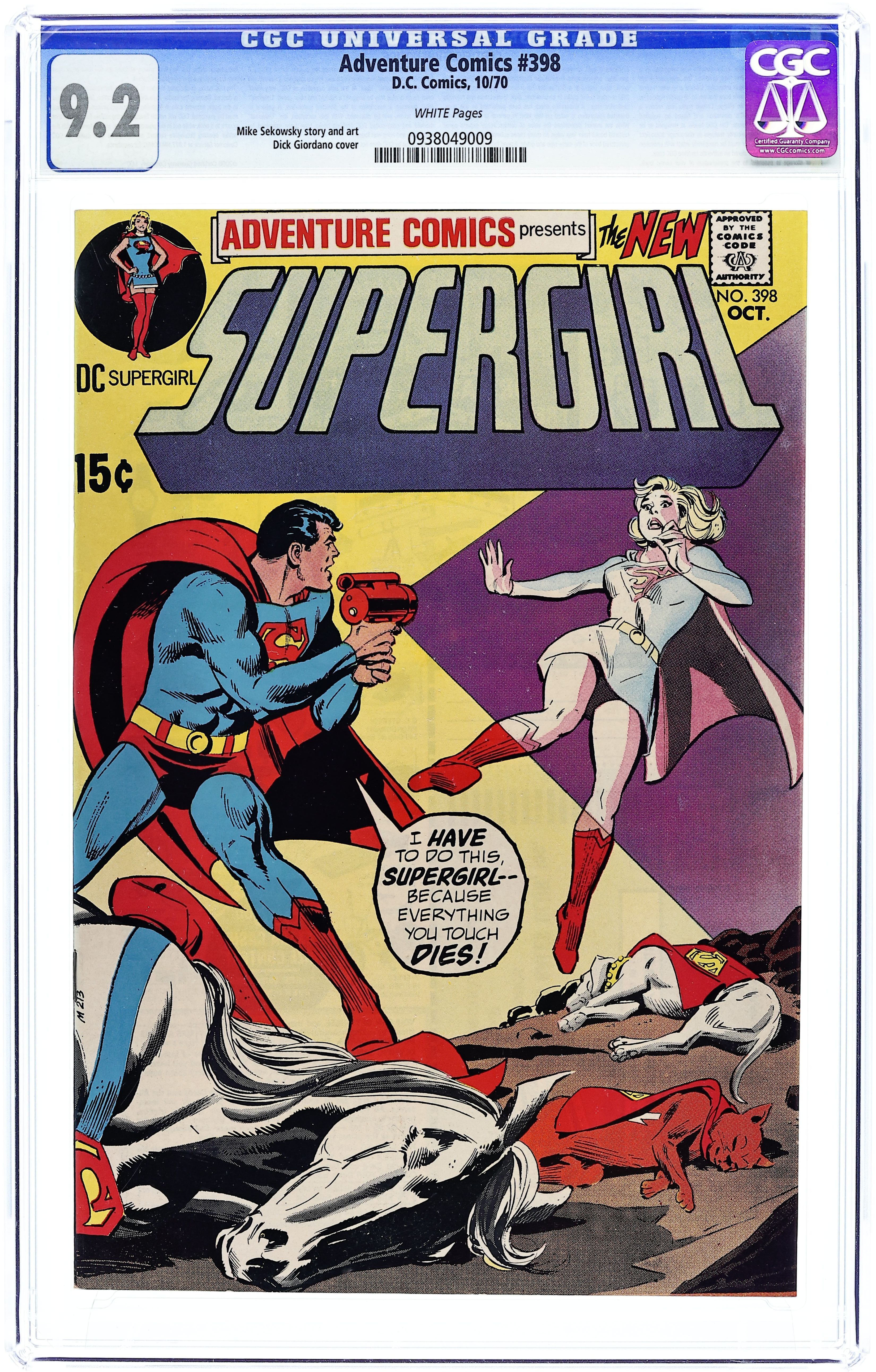 Cover art by Dick Giordano. The Maid of Doom! starring Supergirl, Superman, Dick Malverne, Edna Danvers, Mr. Mxyzptlk, and Mon-El and Brainiac 5 (flashback), script by Leo Dorfman, art by Jim Mooney; it seems as though everything Supergirl touches dies. New Supergirl costume ideas from readers. Catcher in the Sky starring Supergirl, script by Mike Sekowsky, pencils by Mike Sekowsky. 36 Pages, Full Color. Cover price $0.15.