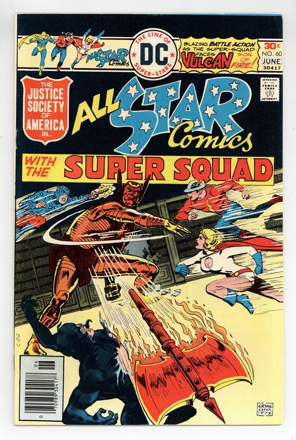 First 30-cent cover price issue. Cover art by Ernie Chan [as Ernie Chua]. Twinkieless Gotham City Hostess ad starring Batman, Robin, and the Penguin, pencils by Curt Swan, inks by Vince Colletta. Vulcan: Son of Fire! starring the All Star Super Squad, script by Gerry Conway, pencils by Keith Giffen, inks by Wally Wood. Justice for All Includes Children public service announcement starring Superman, pencils by Curt Swan, inks by Vince Colletta. Article explaining that Power Girl is the artistic creation of Joe Orlando. 36 Pages, Full Color. Cover price $0.30.
