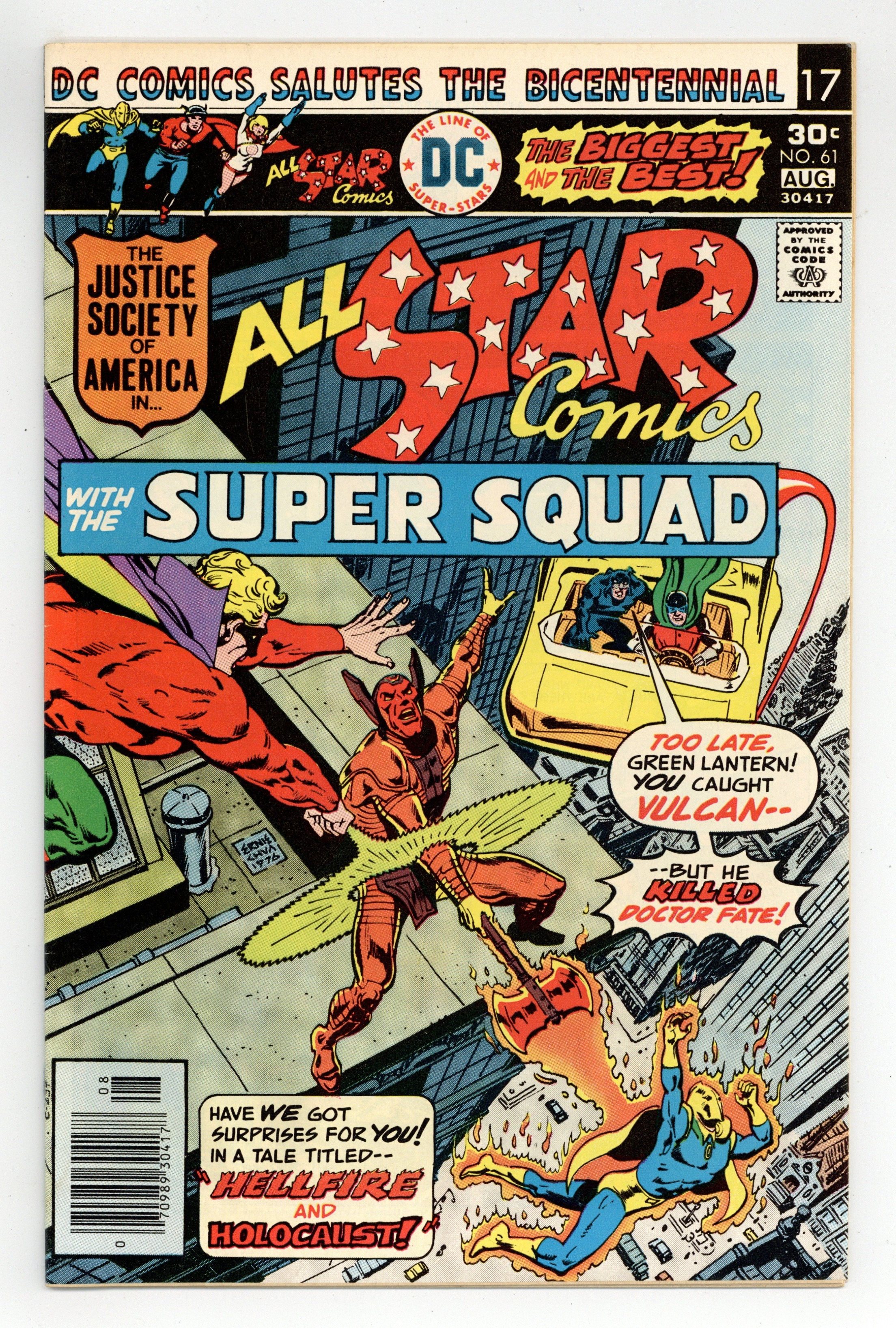 Cover art by Ernie Chan [as Ernie Chua]. Superman Saves the Earth Hostess ad, pencils by Curt Swan, inks by Vince Colletta. Hellfire and Holocaust starring the All Star Super Squad, script by Gerry Conway, pencils by Keith Giffen, inks by Wally Wood; As the JSA/ Super Squad faces off vs. Vulcan, Dr. Fate is injured and left in a coma as an ancient alien menace, Zanadu, surfaces shortly after Vulcan is defeated. Justice for All Includes Children public service announcement starring Superman, pencils by Curt Swan, inks by Vince Colletta. 36 Pages, Full Color. Cover price $0.30.