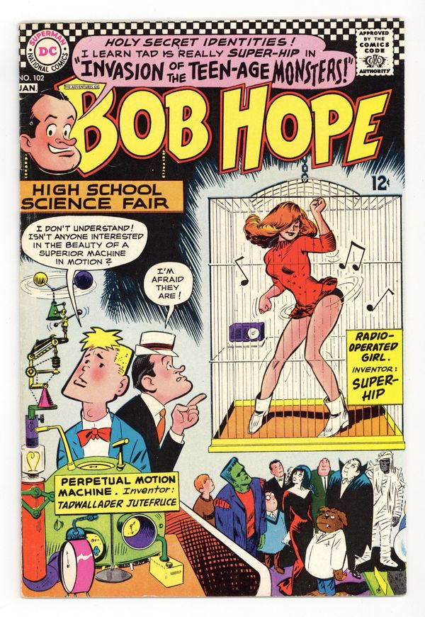 Cover by Bob Oksner. Written by Arnold Drake and Henry Boltinoff. Art by Bob Oksner and Henry Boltinoff. Holy secret identities! Bob Hope learns that Tad is really Super-Hip in "The Invasion of the Teen Monsters" by Arnold Drake and Bob Oksner. Also starring Lisa, Henrietta, Badger Goldliver, Doltish, Harvard Harvard III, Dr. Van Pyre, Heinrich Von Wolfmann and Frank N. Stein. Plus: Cap's Hobby Hints activity half-pager by Henry Boltinoff. And: Bob's Gag Bag text piece. 32 pages, full color. Cover price $0.12.