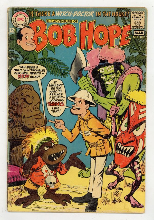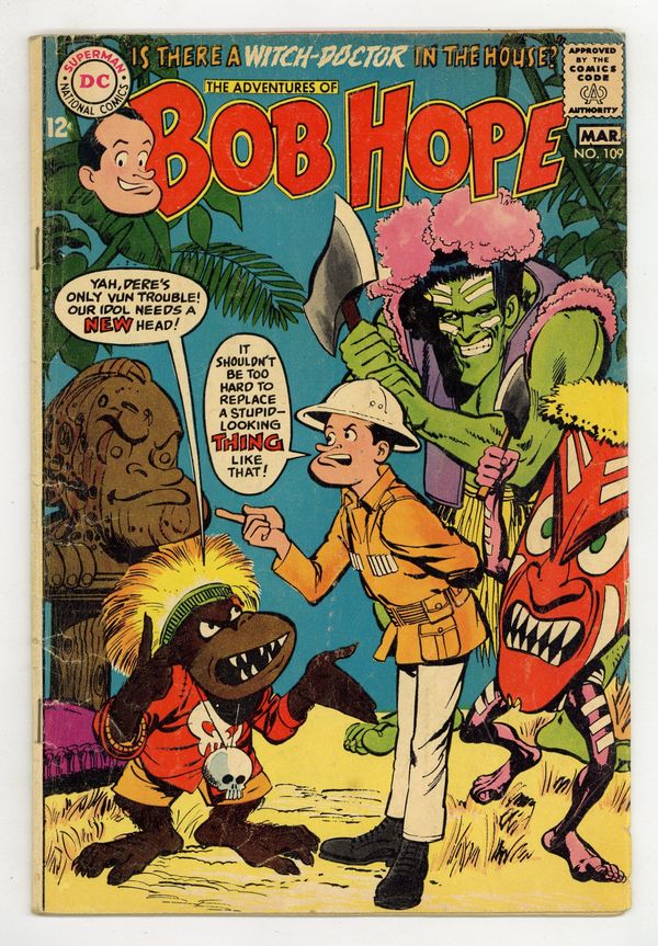 Cover by Neal Adams. Written by Arnold Drake, Henry Boltinoff and unknown. Art by Neal Adams, Henry Boltinoff and unknown. In this final issue, Bob Hope, still America's favorite funnyman, gets kidnapped and sent to an island in the Pacific Ocean in "Is There a Witch Doctor in the House?" by Arnold Drake and Neal Adams. Also starring Harvard Harvard III, Super-Hip, Lisa, Dr. Ookanooka, Nurse Nudnick, Badger Goldliver, Godfrey Goldliver, Doltish, Henrietta, Heinrich Von Wolfmann, Frank N. Stein, Zombia Ghastly, Dr. Van Pyre and Chief Moogi. Plus: Cap's Hobby Hints activity half-pager by Henry Boltinoff; Bob's Gag Bag text piece; and Liz back-up story, reprinted from Leave It to Binky (1948) #51. 32 pages, full color. Cover price $0.12.