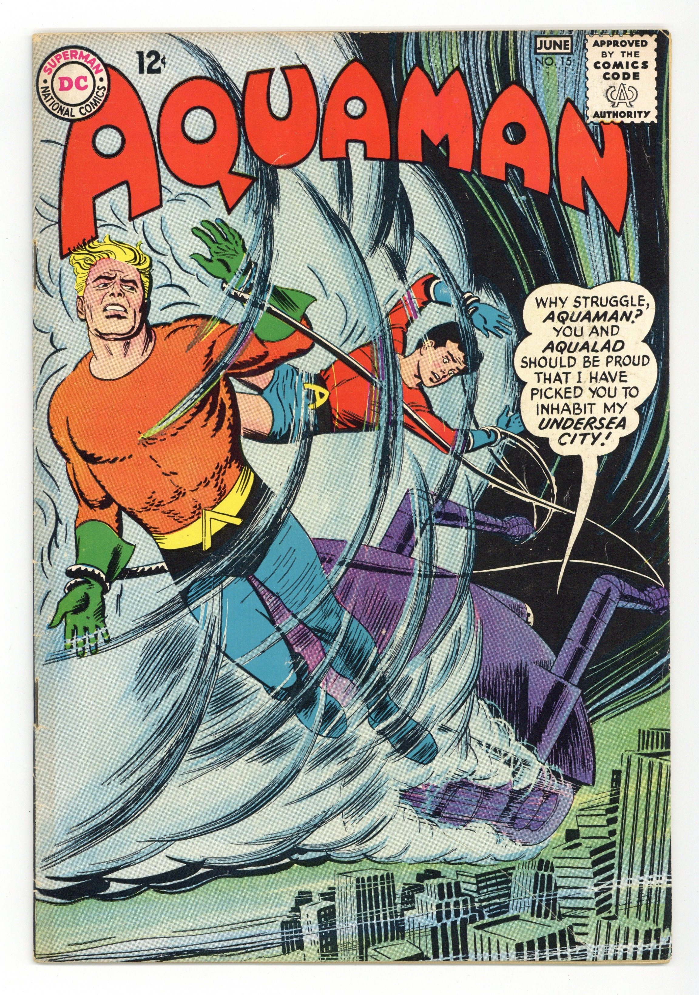 Cover art by Nick Cardy. Menace of the Man-Fish starring Aquaman, Aqualad, Mera, and Dr. Deering, art by Nick Cardy; during a botched experiment, Dr. Deering is changed into a water breather; he then proceeds to steal buildings and construct an underwater city. Underwater Oddities article. 36 pgs. $0.12. Cover price $0.12.