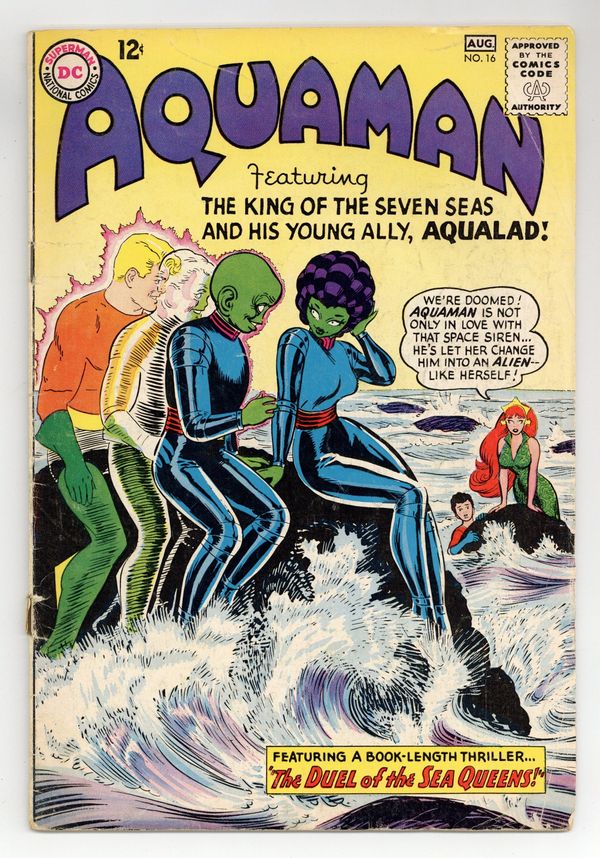 Cover art by Nick Cardy. The Duel of the Sea Queens! starring Aquaman, Aqualad, Mera, Sirene, Rovere, and Stellor, art by Nick Cardy; Aquaman is replaced by an alien changeling; Mera rescues the real Aquaman. Cap's Hobby Center activity page by Henry Boltinoff. The Gassy Seas article. 36 pgs. $0.12. Cover price $0.12.