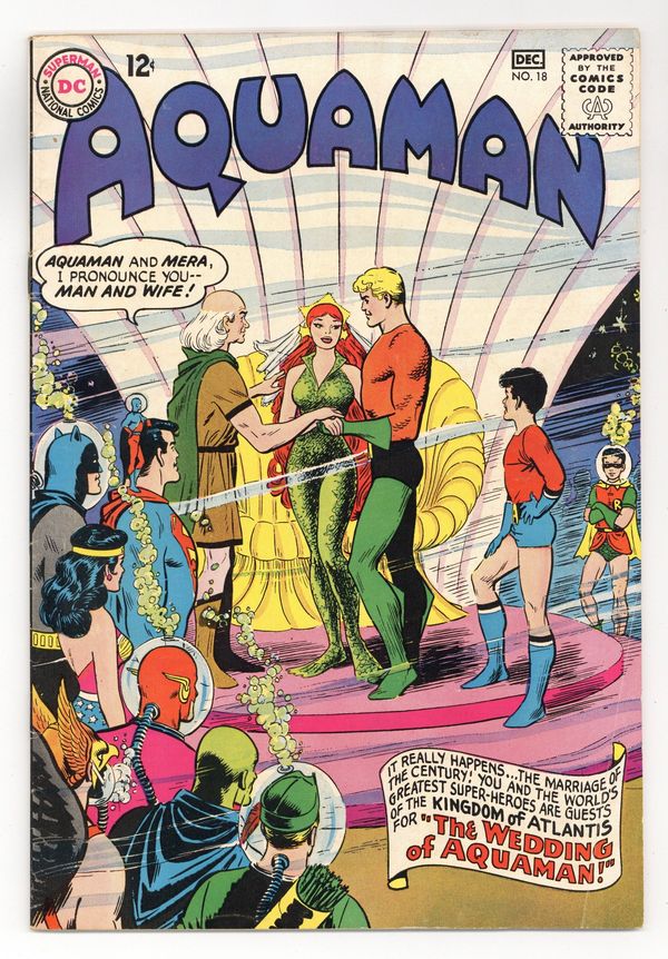 Cover art by Nick Cardy. The Wife of Aquaman, script by Jack Miller, art by Nick Cardy; Wedding of Aquaman and Mera; Cameos by Superman, Batman, Wonder Woman, Atom, Flash, Hawkman, J'onn J'onzz, Green Arrow, Robin; Mera loses powers. Escape to the Sea article. 36 pgs. $0.12. Cover price $0.12.