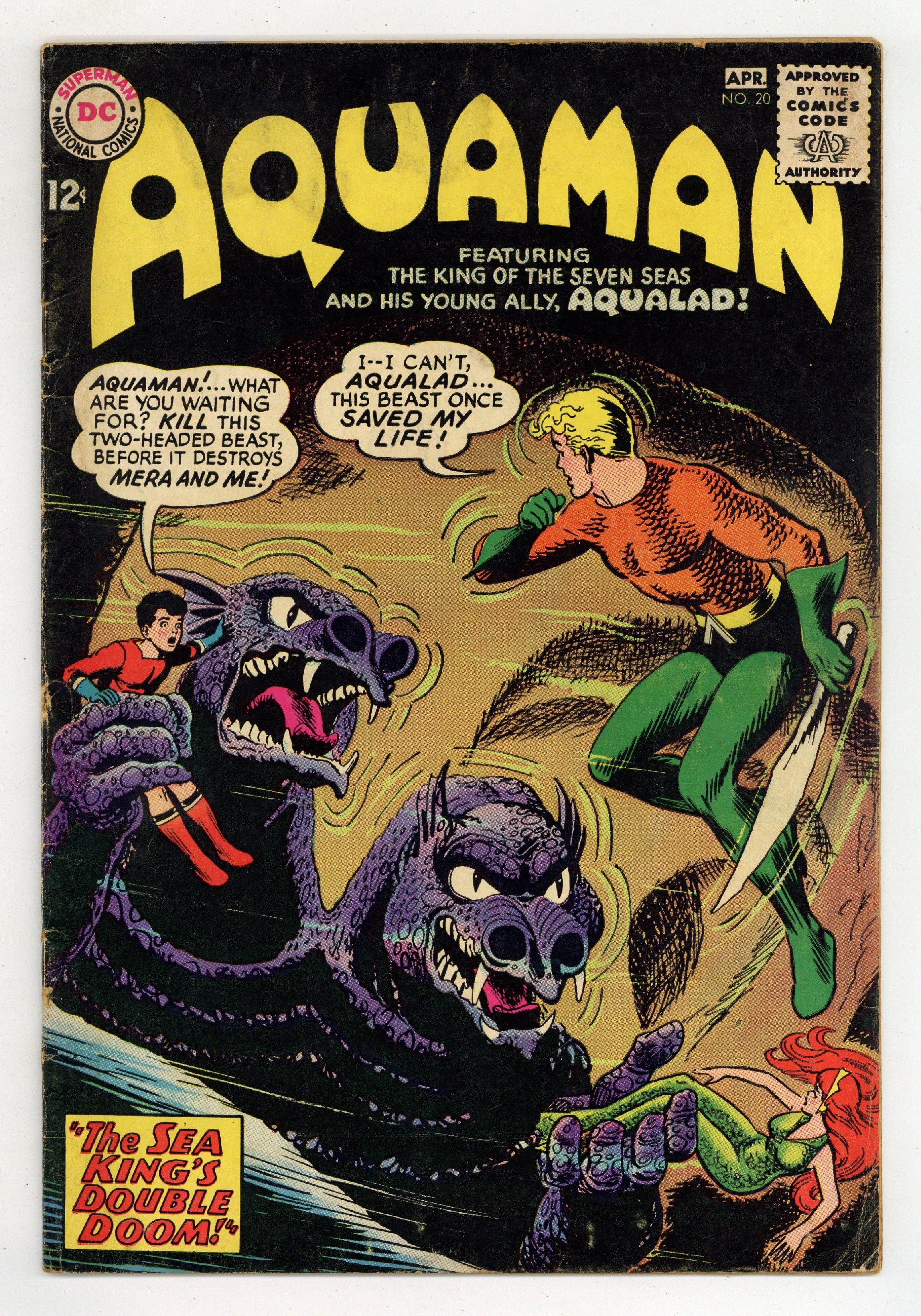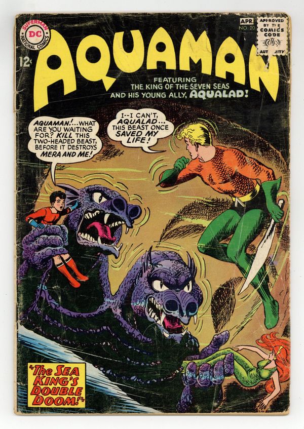Cover art by Nick Cardy. The Sea King's Double Doom starring Aquaman, Aqualad, Mera, Sea Imp (intro), Kaltor, Luknan, and Starene, art by Nick Cardy; Aquaman follows an undersea creature who has taken an Atlantean prisoner. Chief Hot Foot humor half-page by Henry Boltinoff. They're Real, Live Fish! fact page. 36 pgs. $0.12. Cover price $0.12.