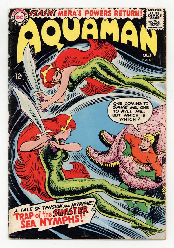 Cover art by Nick Cardy. Trap of the Sinister Sea Nymphs starring Aquaman, Aqualad, Mera, Hila, Kandor (not the bottled city, villain), and Professor Kreon, art by Nick Cardy; Kandor captures Mera and Aquaman; Hela goes to Atlantis pretending to be Mera; Professor Kreon restores Mera's powers. The Color of Water article. 36 pgs. $0.12. Cover price $0.12.