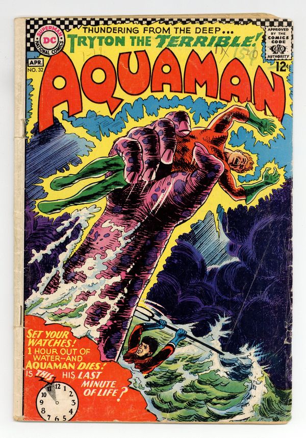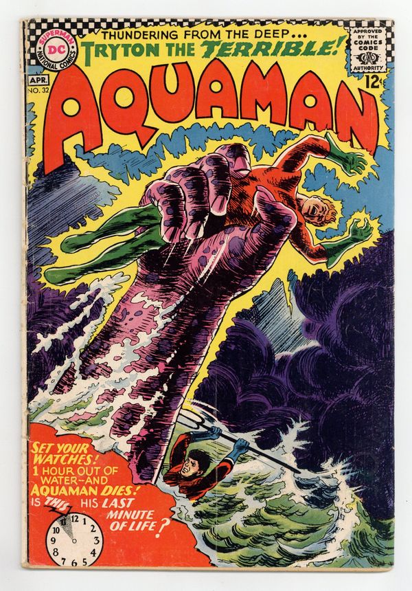 $24.00Cover art by Nick Cardy. Tryton the Terrible starring Aquaman, Aqualad, Mera, Aquababy, Ocean Master, and Tryton the Terrible, script by Bob Haney, art by Nick Cardy; a giant hand grabs Aquaman; Mera creates a giant water hand to try and save him; Aquaman disarms a missile. 36 pgs. $0.12. Cover price $0.12.
