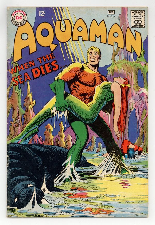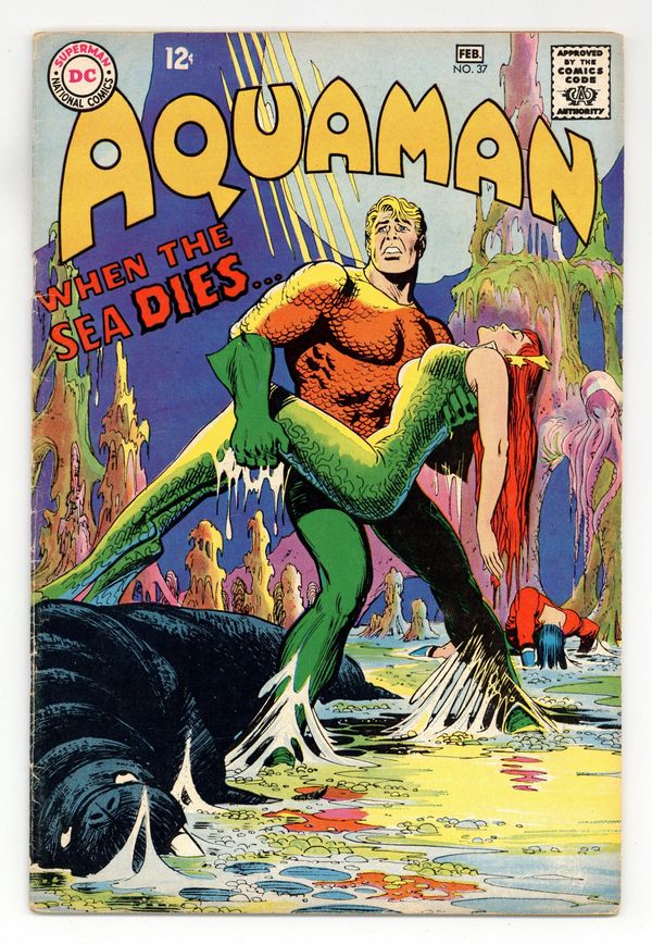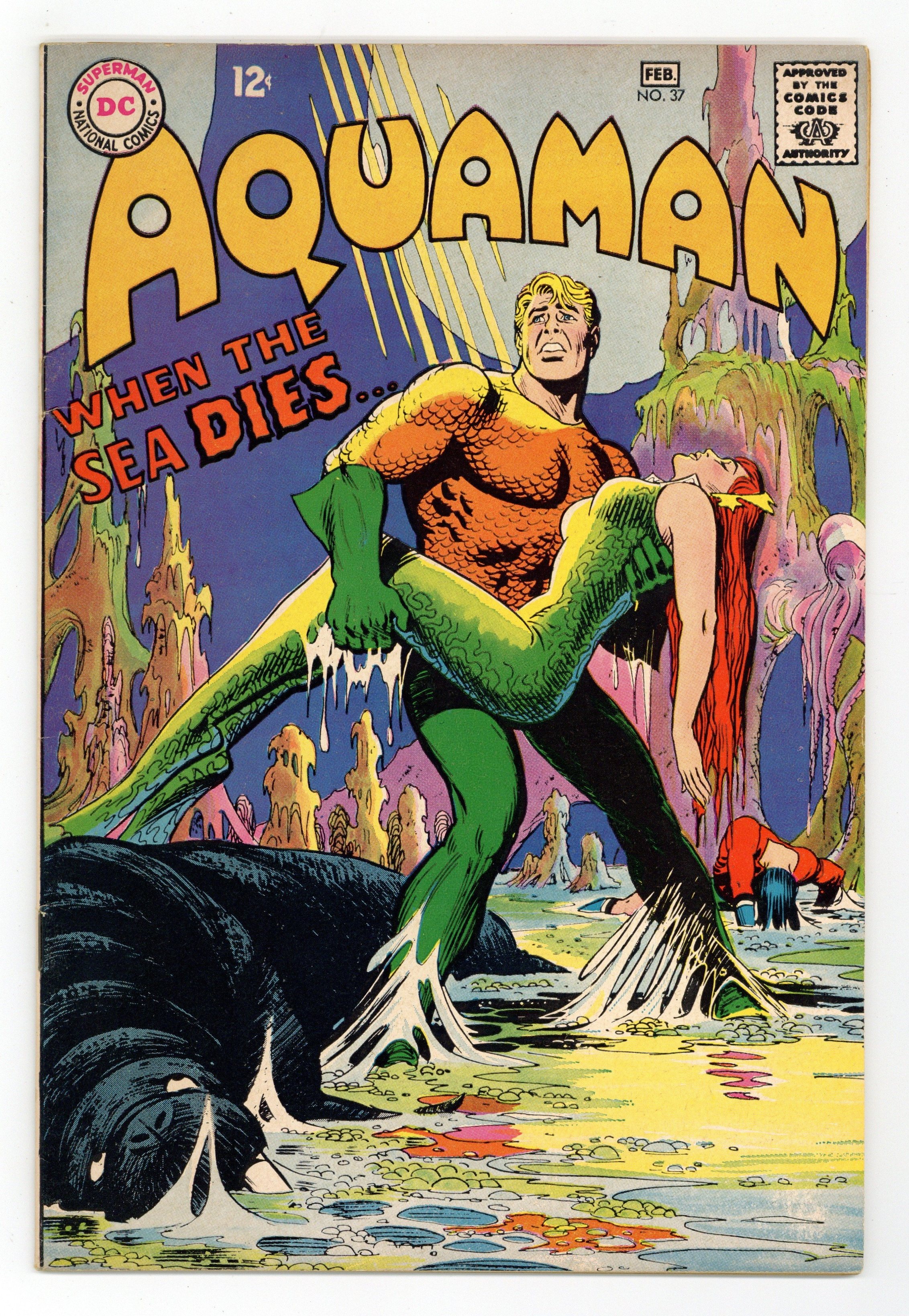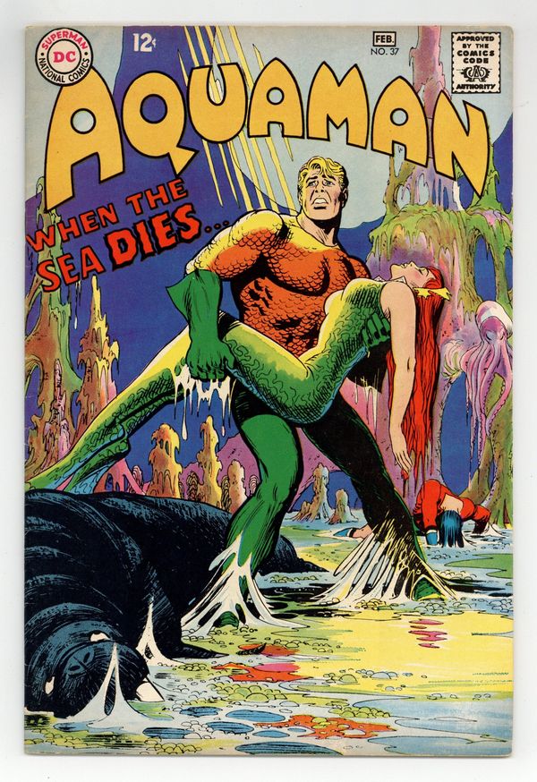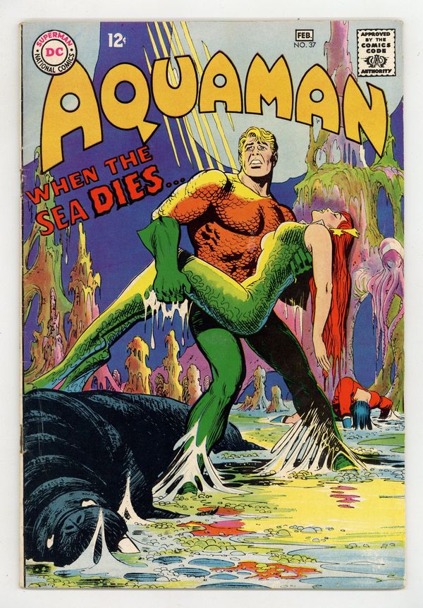 Tags: Aquaman$24.00Cover art by Nick Cardy. When the Sea Dies! starring Aquaman, Aqualad, Mera, Aquababy, Ocean Master (villain), and The Scavenger, script by Bob Haney, art by Nick Cardy; a sea cataclysm interrupts a battle between Aquaman and Ocean Master; the sea begins dying; Mera and Aquababy are kidnapped. Cap's Hobby Hints activity page by Henry Boltinoff. Freddie the Frogman humor page by Henry Boltinoff. 36 pgs. $0.12. Cover price $0.12.
