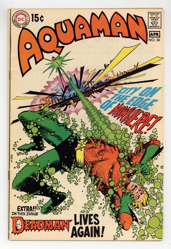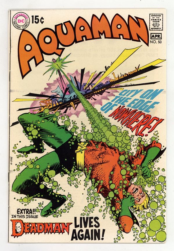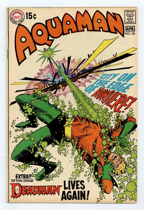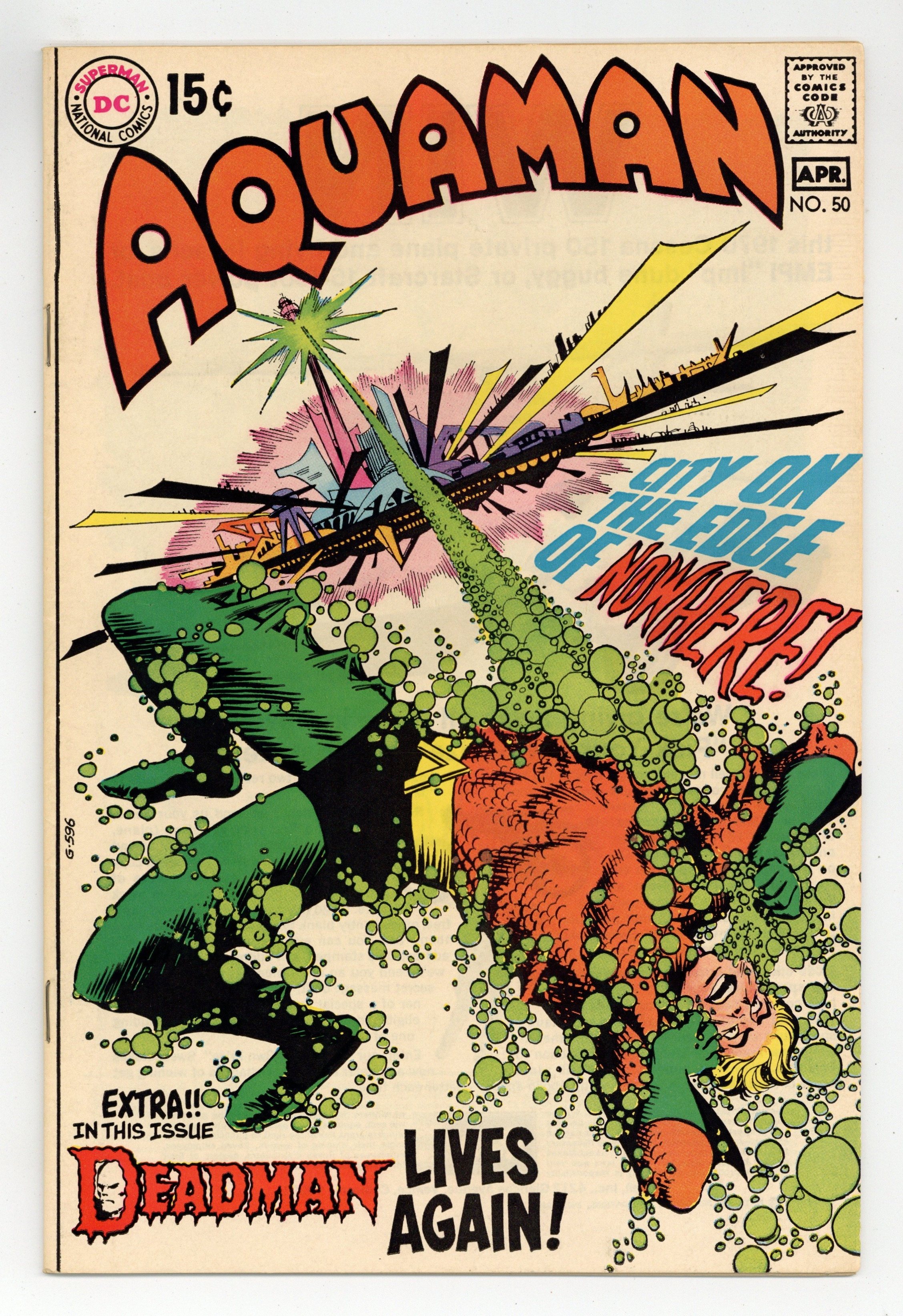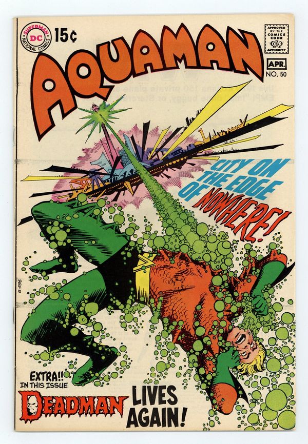 $48.50Cover art by Nick Cardy. Can This Be Death?.. The City on the Edge of Nowhere, script by Steve Skeates, art by Jim Aparo; Aquaman and Atlantis return to Atlantis and find Mera talking with the Ocean Master; Aquaman gets shot by an alien. Deadman Rides Again! starring Deadman [Boston Brand], Taj Ze, Rama, and Ocean Master, script and art by Neal Adams; Deadman makes an attempt to possess Ocean Master. 36 pgs. $0.15. Cover price $0.15.