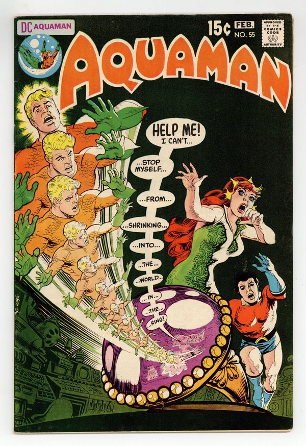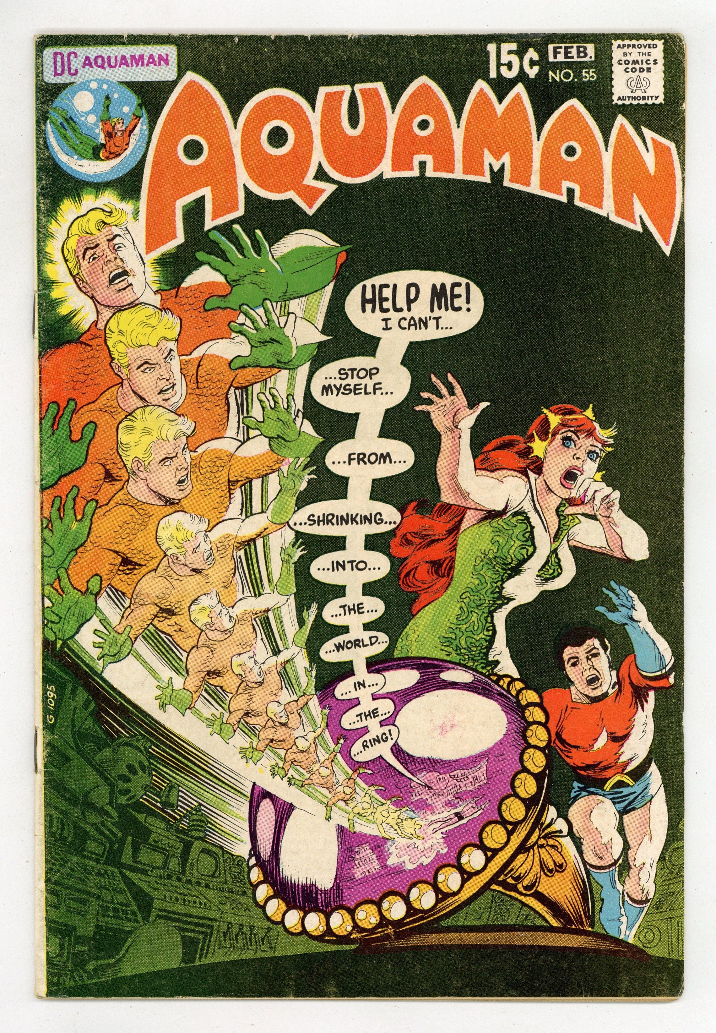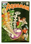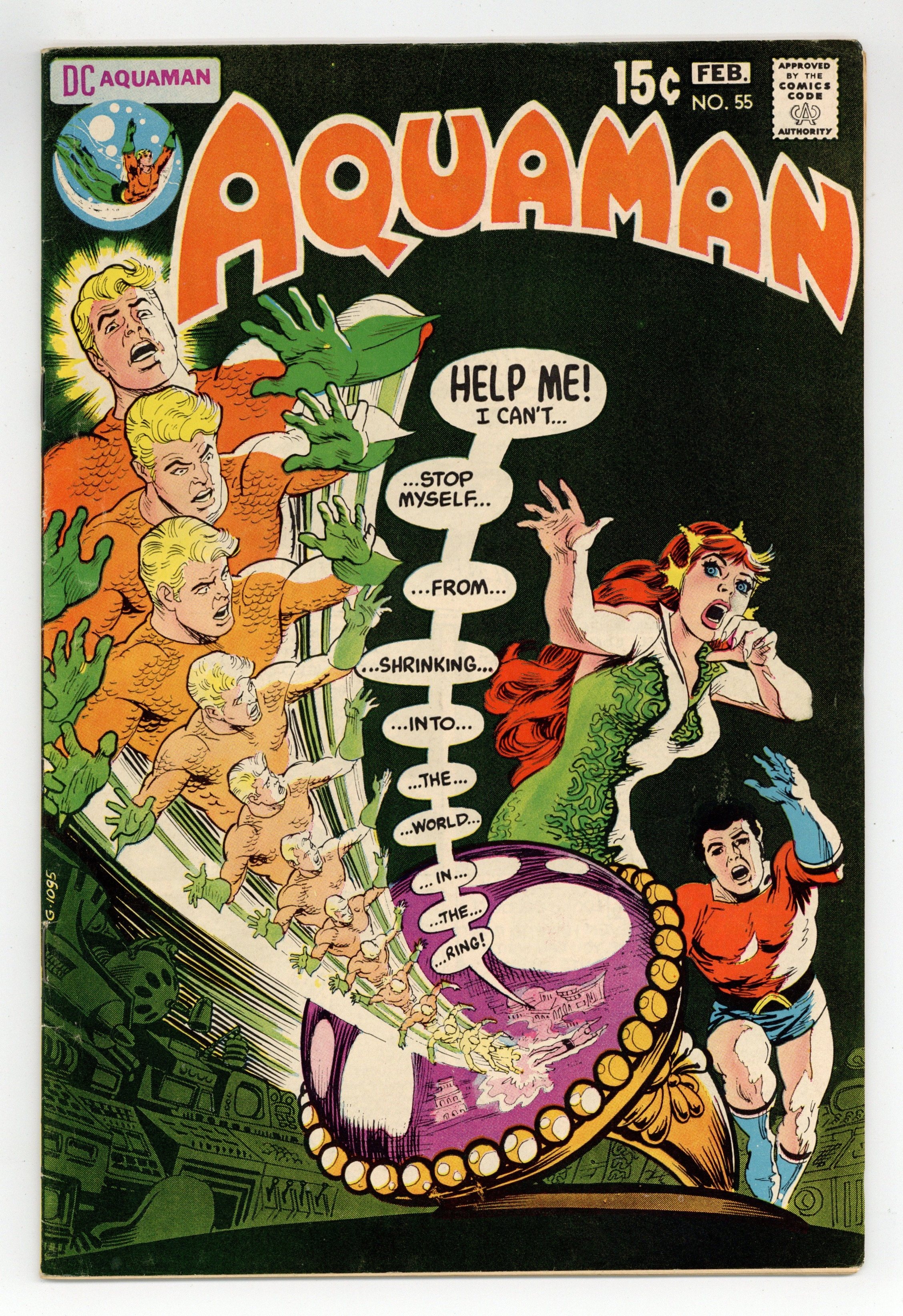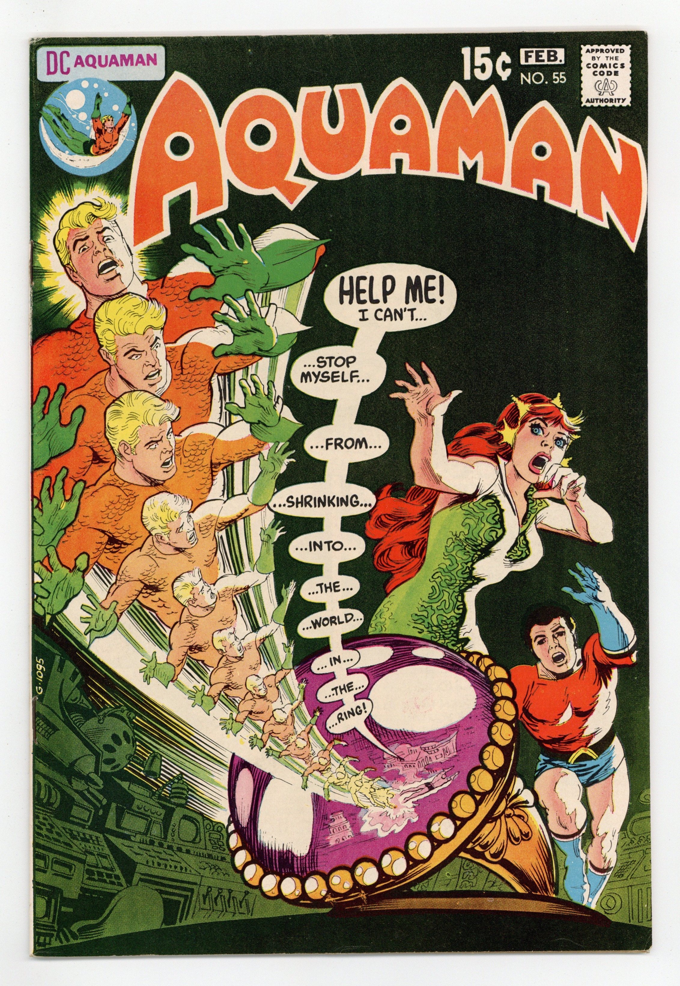 Cover art by Nick Cardy. Return of the Alien!, script by Steve Skeates, art by Jim Aparo; Aquaman gets Dr. Vulko to create a machine that will enable him to re-enter the world of the ring; he returns there to help the girl who was left in the hands of slavers. Computer Trap!, script by Steve Skeates, art by Jim Aparo; while taking a shortcut home, Aquaman runs across a desolate city once controlled by a computer. 36 pgs. $0.15. Cover price $0.15.