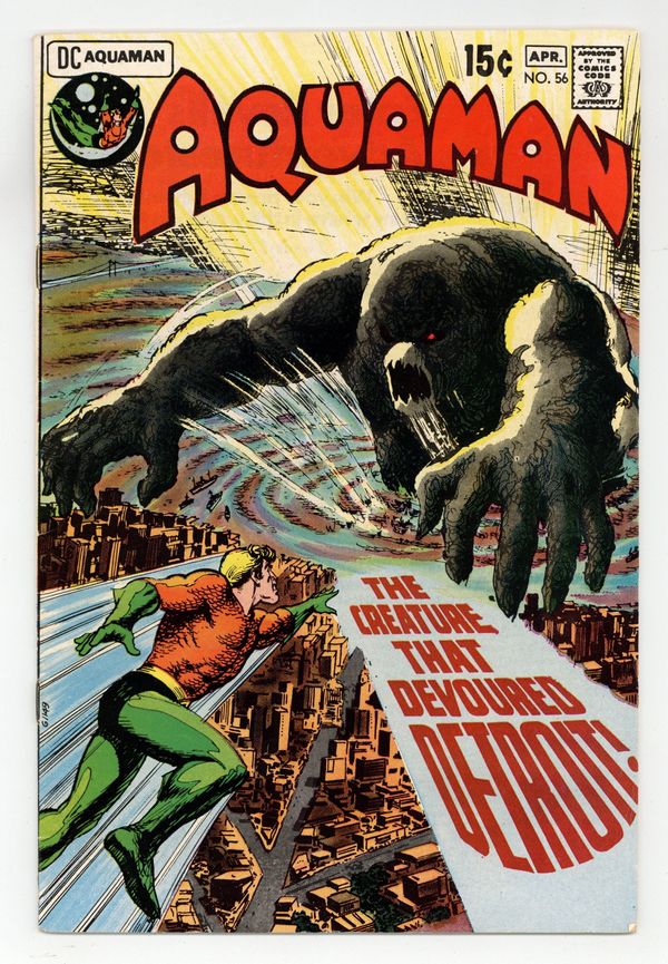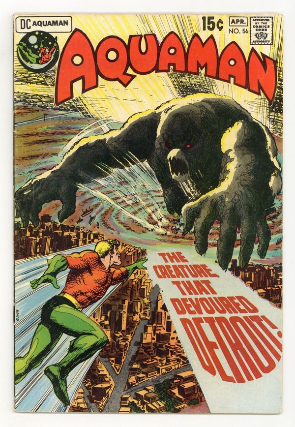 Cover art by Nick Cardy. The Creature that Devoured Detroit!, script by Steve Skeates, art by Jim Aparo; while waiting to appear on a talk show, Aquaman learns that Detroit is being covered by algae from Lake Erie. The Cave of Death!, script by Steve Skeates, art by Jim Aparo; Aquagirl rescues a kid playing near a cave. Last 15c cover-priced issue. NOTE: Next issue, #57, isn't published until Sept. 1979. 36 pgs. $0.15. NOTE: Aquaman #56 and Sub-Mariner #72 is the infamous hidden DC/Marvel crossover! Writer Steve Skeates, unbeknownst to the editorial staffs of Marvel and DC, creates the very first intercompany crossover between the Big Two. Aquaman battles a creature that at the end of the issue explodes in outer space. A few years later, the very same creature emerges in the Marvel Universe from an explosion in outer space. This has to be one of the most underrated and coolest hidden gems in Comics History. – Odinson, Lone Star Comics Archivist Cover price $0.15.