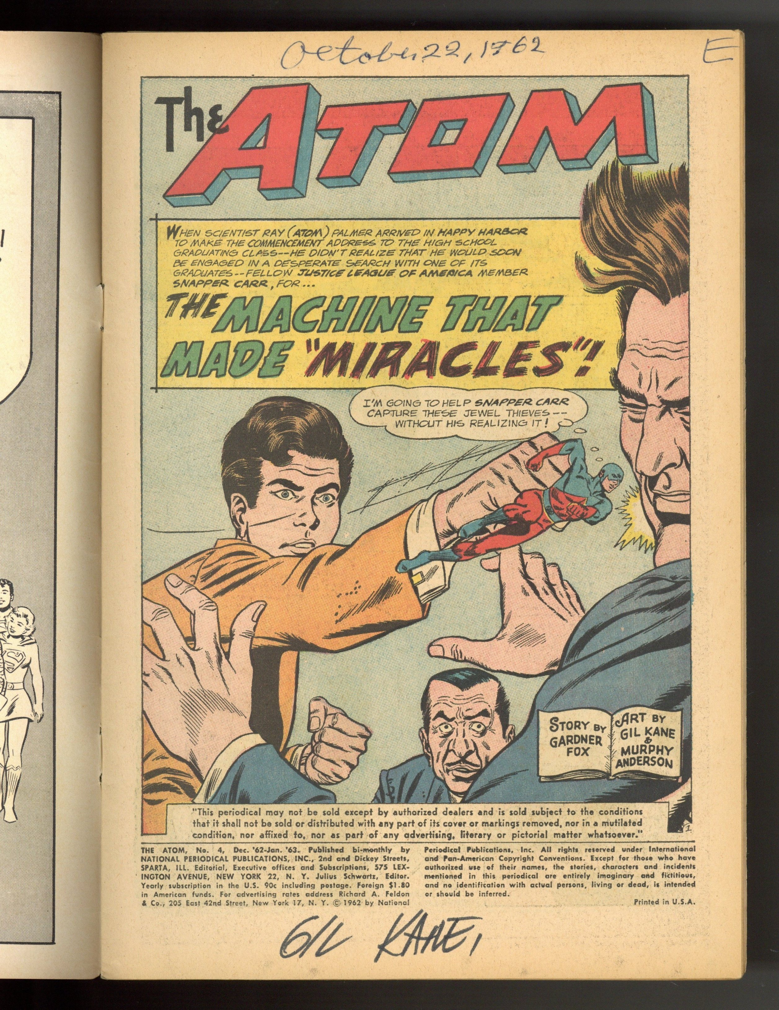 Starts Feb 23 Cover pencils by Gil Kane, inks by Murphy Anderson. "The Machine That Made 'Miracles'!", script by Gardner Fox, pencils by Gil Kane, inks by Murphy Anderson; Traveling to Happy Harbor to give a speech to graduates at Snapper Carr's home, Ray witnesses as Snapper's boat suddenly goes from being an ordinary row-boat to a giant sail boat he wishes he has; Deciding to learn the cause of his mystery, Ray changes into the Atom and decides to secretly help Snapper, so that Snapper has a good story to share with his fellow Justice League members; When crooks realize that something around Happy Harbor is turning dreams into reality, they try to steal some dress jewels that have become real. "The Case of the Innocent Thief!", script by Gardner Fox, pencils by Gil Kane, inks by Murphy Anderson; When a series of crimes are committed by people who have concrete alibis that put them far away from the robbery, Ray Palmer decides to figure it out as the Atom. Letter to the editor from MyComicShop owner Buddy Saunders. 36 pgs., full color. $0.12. Cover price $0.12.
