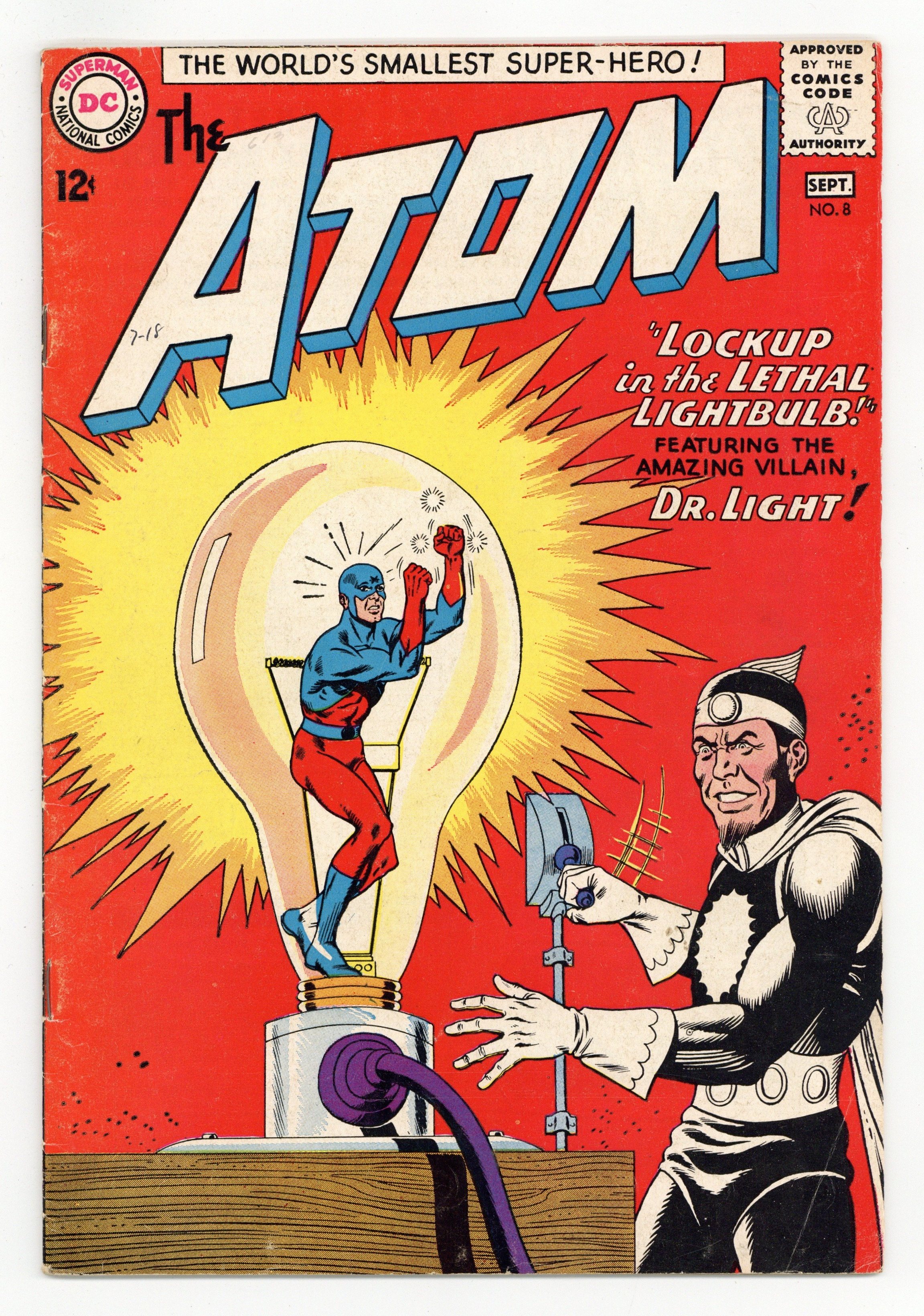 Cover pencils by Gil Kane, inks by Murphy Anderson. Brief appearance of the Justice League of America in "Lockup in the Lethal Lightbulb!", script by Gardner Fox, pencils by Gil Kane, inks by Murphy Anderson; Doctor Light sets a trap for the Atom in another dimension to test a new means to destroy the Justice League. Celebrate the Silver Anniversary of Superman! ad. Batman and Robin ad. Superman's Girl Friand Lois Lane. "The Purloined Miniatures," script by Gardner Fox, pencils by Gil Kane, inks by Sid Greene; Jean Loring loses her first case when she defends a man accused in a museum theft, and it's up to the Atom to prove the man was framed. Letter to the editor from E. Nelson Bridwell and Jack Harris. 36 pgs., full color. $0.12. Cover price $0.12.