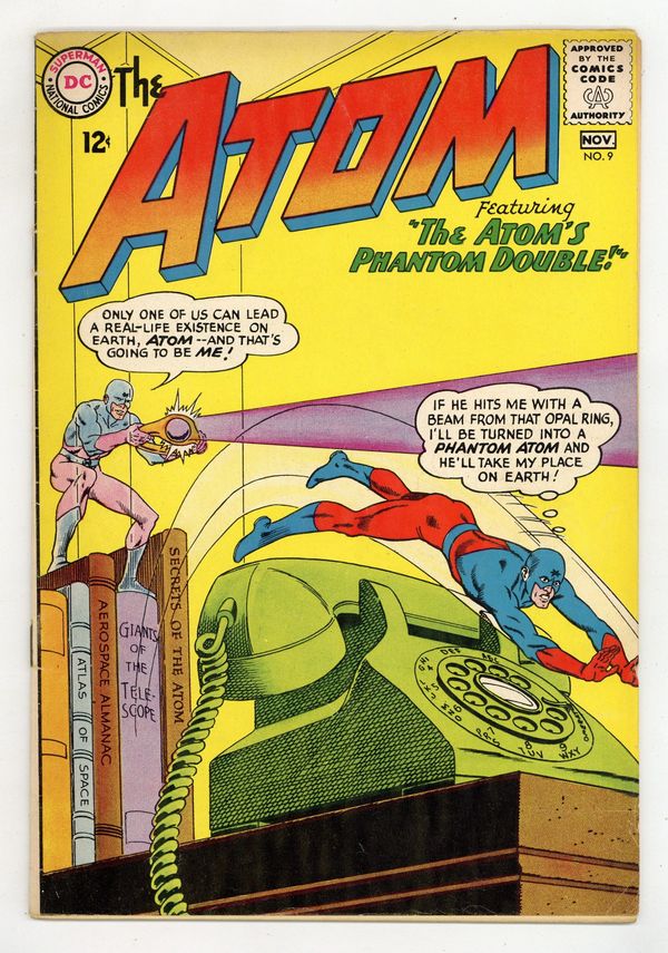 Cover pencils by Gil Kane, inks by Murphy Anderson. "The Atom's Phantom Double!", script by Gardner Fox, pencils by Gil Kane, inks by Murphy Anderson; A laboratory accident creates a ghostly duplicate of Ray Palmer, who wants to take the real Ray's place by destroying him. Ad for The Flash. It's a Small World! article about the smallest particles on earth by Julius Schwartz. "The Seaman and the Spyglass!", script by Gardner Fox, pencils by Gil Kane, inks by Sid Greene; The Atom travels back to Holland in the year 1610 where he meets explorer Henry Hudson and Jan Lippershey, inventor of the telescope. 36 pgs., full color. $0.12. Cover price $0.12.