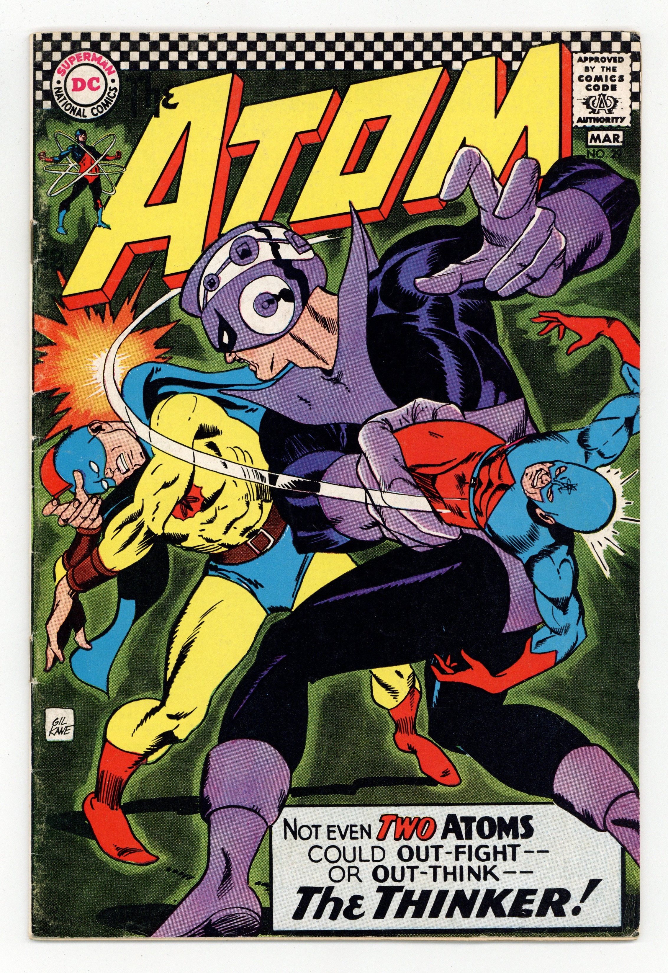 Cover by Gil Kane. 1st solo Golden Age Atom appearance in Silver Age in "The Thinker's Earth-Shaking Robberies!", script by Gardner Fox, pencils by Gil Kane, inks by Sid Greene; Ray Palmer and Jean Loring are on a date, looking over rare book ends; Everyone in the exhibit hall suddenly doubles over in pain; Ray spots the Thinker attempting to rob the book end; Ray changes to the Atom and attempts to stop the Thinker, whose henchmen attack him with harpoon guns. Statement of ownership - average print run 390,000; average paid circulation 232,850. 36 pgs., full color. $0.12. Cover price $0.12.