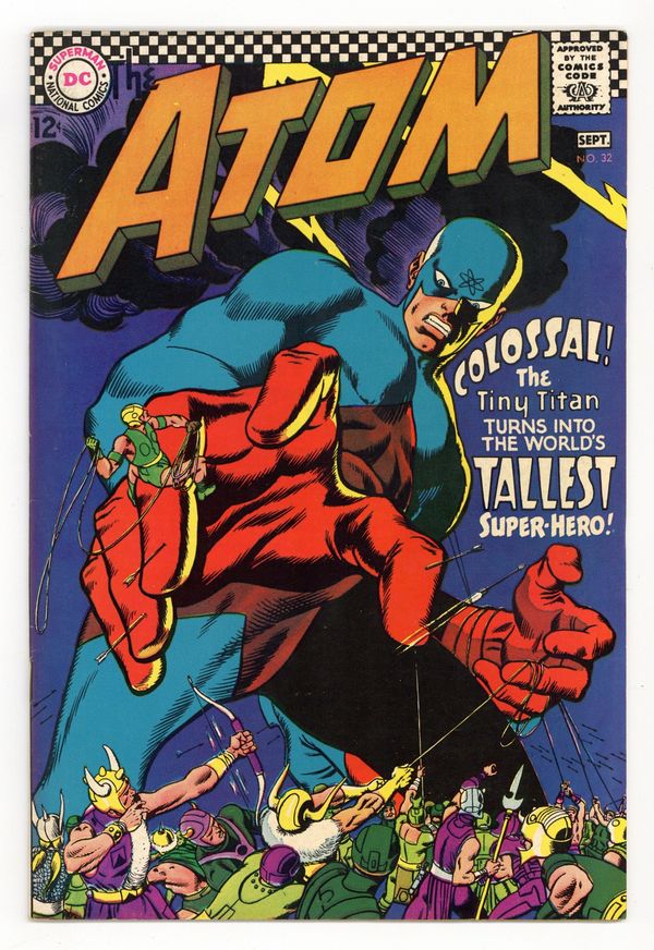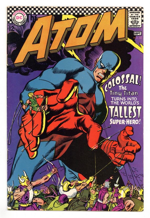 $16.50Cover pencils by Gil Kane, inks by Murphy Anderson. "The Up and Down Dooms of the Atom," script by Gardner Fox, pencils by Gil Kane, inks by Sid Greene; At the Ivy Town Science fair, Jean Loring is helping Ray Palmer demonstrate a new device that will enable people to "energize" the metal of their cars, making it more durable; However, a freak earthquake causes the beam of the device to strike Ray, putting him in paralysis state; Rushed to the hospital, Ray is left alone with Jean while the doctors try to understand the effect the beam had on Ray's body; Immobile, but still conscious, Ray realizes the only way to cure himself is to shrink down to microscopic size; Coincidentally, the ray has given Ray temporary telepathic powers, and he manages to command Jean to activate his invisible size control device. Letter from super fan Guy H. Lillian III. 36 pgs., full color. $0.12. Cover price $0.12.