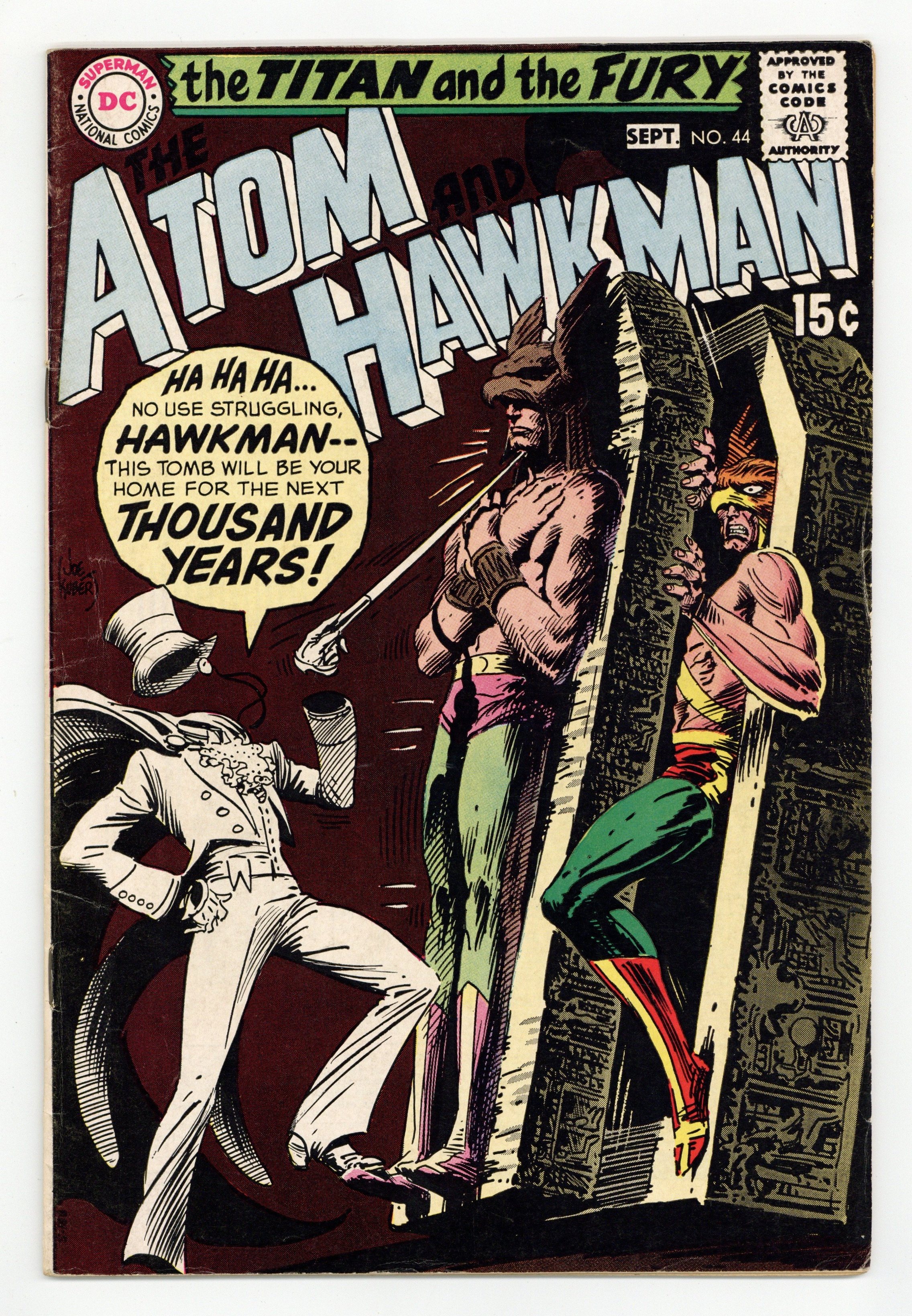 Cover by Joe Kubert. "The Ghost Laughs Last!", script by Bob Kanigher, art by Murphy Anderson; Hawkman's battle with the Gentleman Ghost continues, with Hawkman steadfast in his belief that Craddock isn't a real spirit; Meanwhile, the Ghost finds a blind psychic named Zita, who falls in love with him; She tells him that her sight can be restored by exposure to a rare jewel, and he promises to get it for her, announcing that he will steal the Empress Ra-Na's necklace from the Louvre; He does so, despite Hawkman and Hawkgirl's stakeout. "Hate Is Where You Find It!", script by Denny O'Neil, pencils by Dick Dillin, inks by Sid Greene; The Atom strives to defend a professor falsely accused of being a Nazi while dealing with a microscopically-sized invader. Letters to the editor from comics writers Bill Mantlo and Martin Pasko. 36 pgs., full color. $0.12. Cover price $0.15.