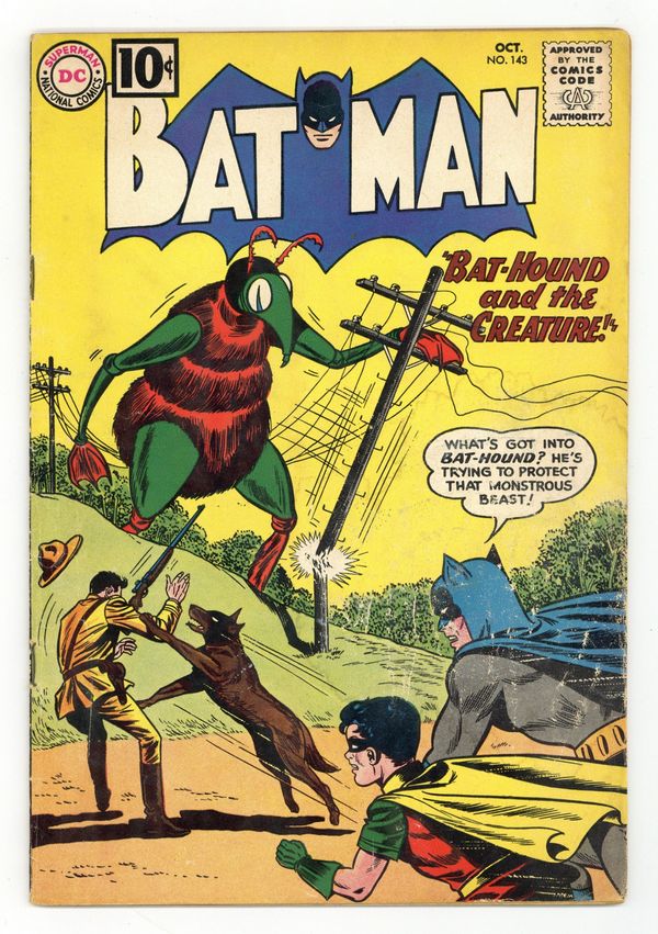 Last 10-cent cover price. Cover by Sheldon Moldoff. "The Twice-Told Tale of Batman and Robin," script by Bill Finger, pencils by Sheldon Moldoff, inks by Charles Paris; After the Caped Crusaders round up a gang of jewel thieves, Robin fantasizes how the adventure would be retold in the future as a mythological tale involving giants and flying creatures. Half-page Jail Jests story by Henry Boltinoff. "The Blind Batman," script by Arnold Drake, art by Sheldon Moldoff; A bump on the head renders Batman blind temporarily, so he creates a set of radar ear plugs that allows him to combat criminals. A Message from Otto the Robot! public service announcement, art by Bernard Baily. "Bat-Hound and the Creature," script by Bill Finger, pencils by Sheldon Moldoff, inks by Charles Paris; While the Caped Crusaders battle Lippy Yates and his gang, Ace befriends a giant alien being, who eventually saves Batman's life. 36 Pages, Full Color. Cover price $0.10.