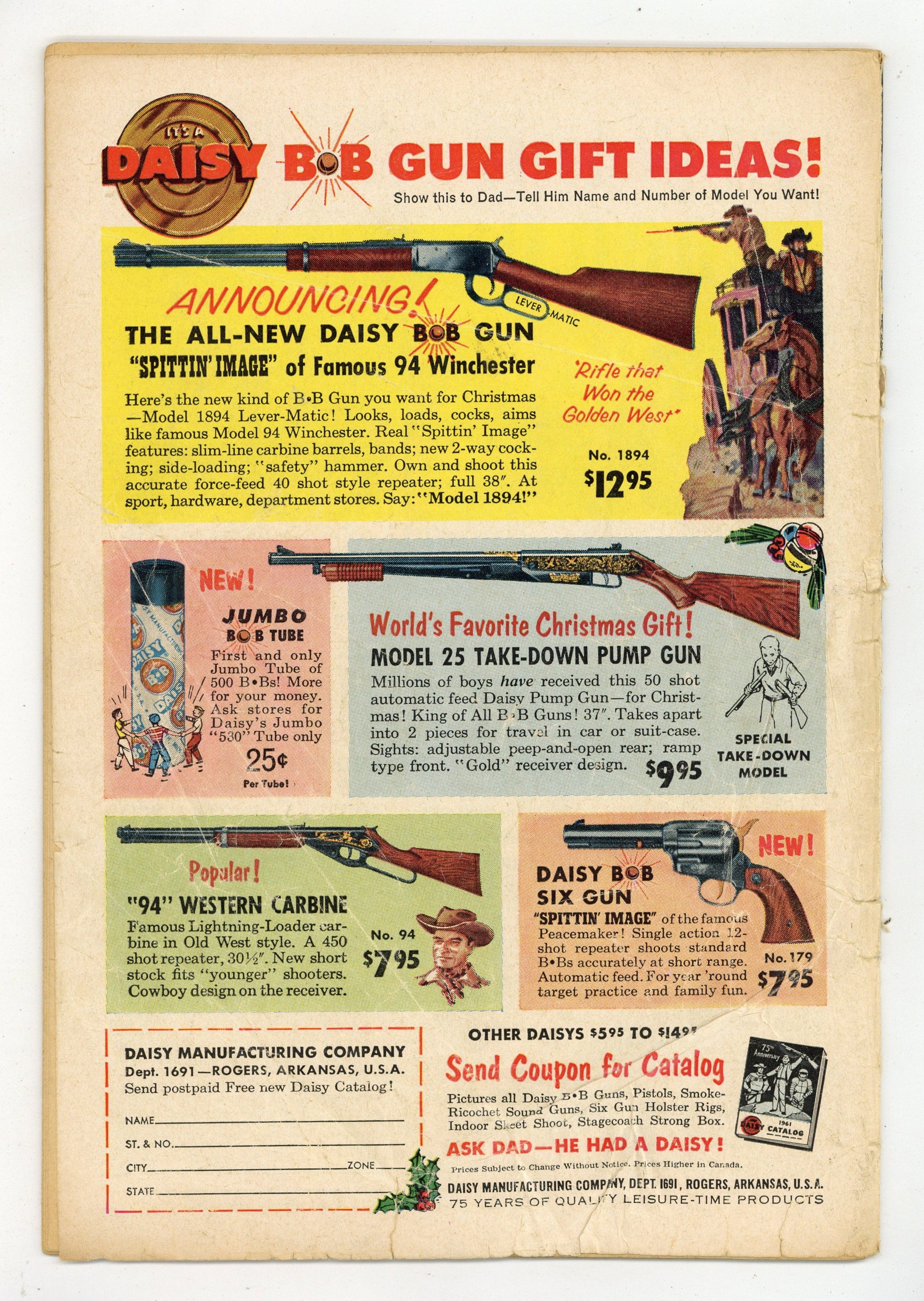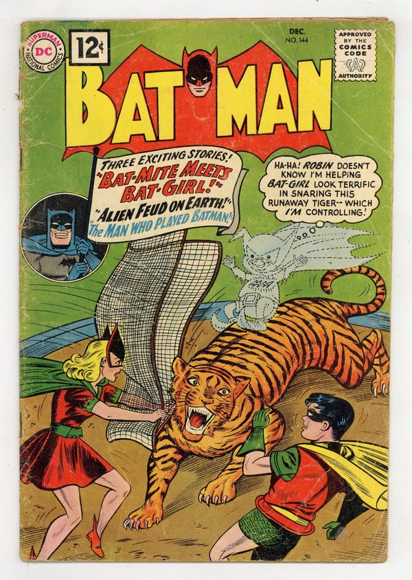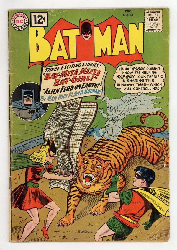 Tags: Batman$95.00First 12-cent cover price. Cover by Sheldon Moldoff. "The Alien Feud on Earth," script by Bill Finger, pencils by Sheldon Moldoff, inks by Charles Paris; Two aliens come to Earth to fight a duel over a girl, and they don't care who gets in the way.Strange Laws humor/non-fiction page by Henry Boltinoff. "The Man Who Played Batman," script by Arnold Drake, art by Sheldon Moldoff; Batman secretly joins a training ground started by the Joker, whose express purpose is to defeat the Batman! "People Are People!" public service announcement, art by Don Cameron. "Bat-Mite Meets Bat-Girl," script by Bill Finger, pencils by Sheldon Moldoff, inks by Charles Paris; Bat-Girl gets seriously jealous when Robin tells her that there is another lady in his life, so Bat-Mite offers to help Bat-Girl get the man she loves. 36 Pages, Full Color. Cover price $0.12.