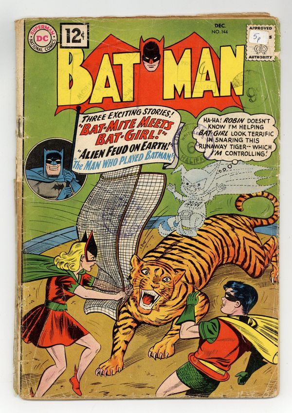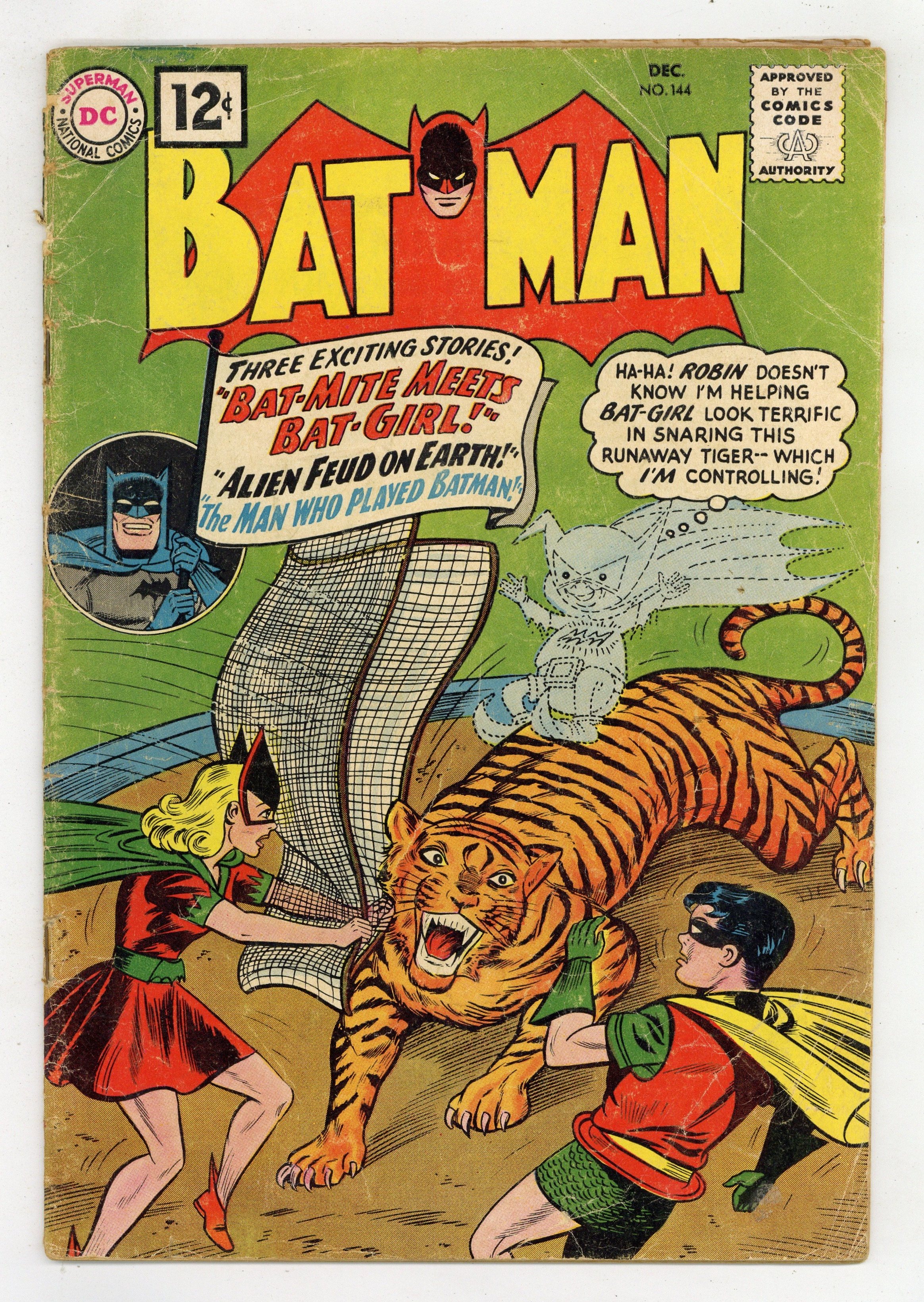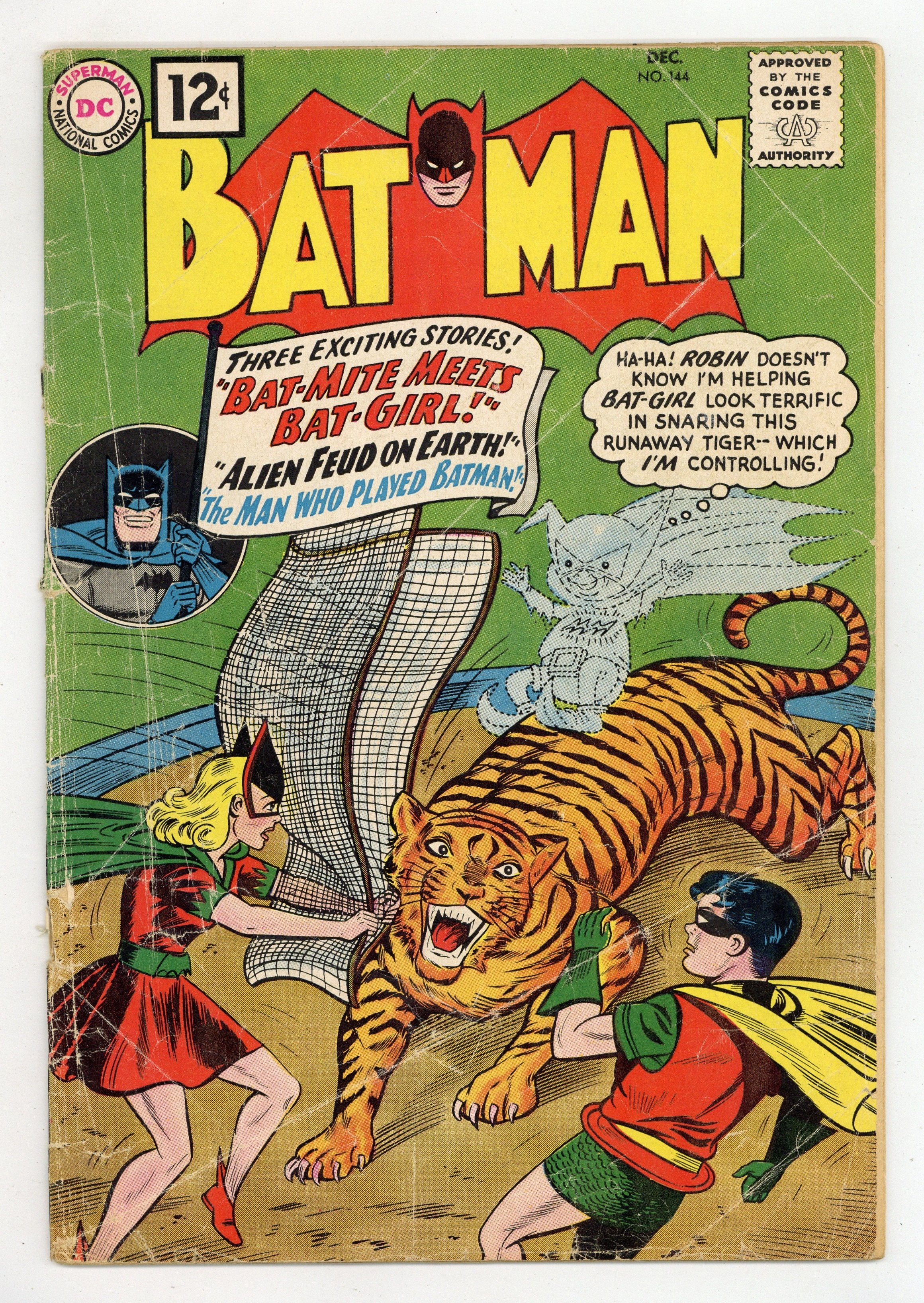 First 12-cent cover price. Cover by Sheldon Moldoff. "The Alien Feud on Earth," script by Bill Finger, pencils by Sheldon Moldoff, inks by Charles Paris; Two aliens come to Earth to fight a duel over a girl, and they don't care who gets in the way.Strange Laws humor/non-fiction page by Henry Boltinoff. "The Man Who Played Batman," script by Arnold Drake, art by Sheldon Moldoff; Batman secretly joins a training ground started by the Joker, whose express purpose is to defeat the Batman! "People Are People!" public service announcement, art by Don Cameron. "Bat-Mite Meets Bat-Girl," script by Bill Finger, pencils by Sheldon Moldoff, inks by Charles Paris; Bat-Girl gets seriously jealous when Robin tells her that there is another lady in his life, so Bat-Mite offers to help Bat-Girl get the man she loves. 36 Pages, Full Color. Cover price $0.12.