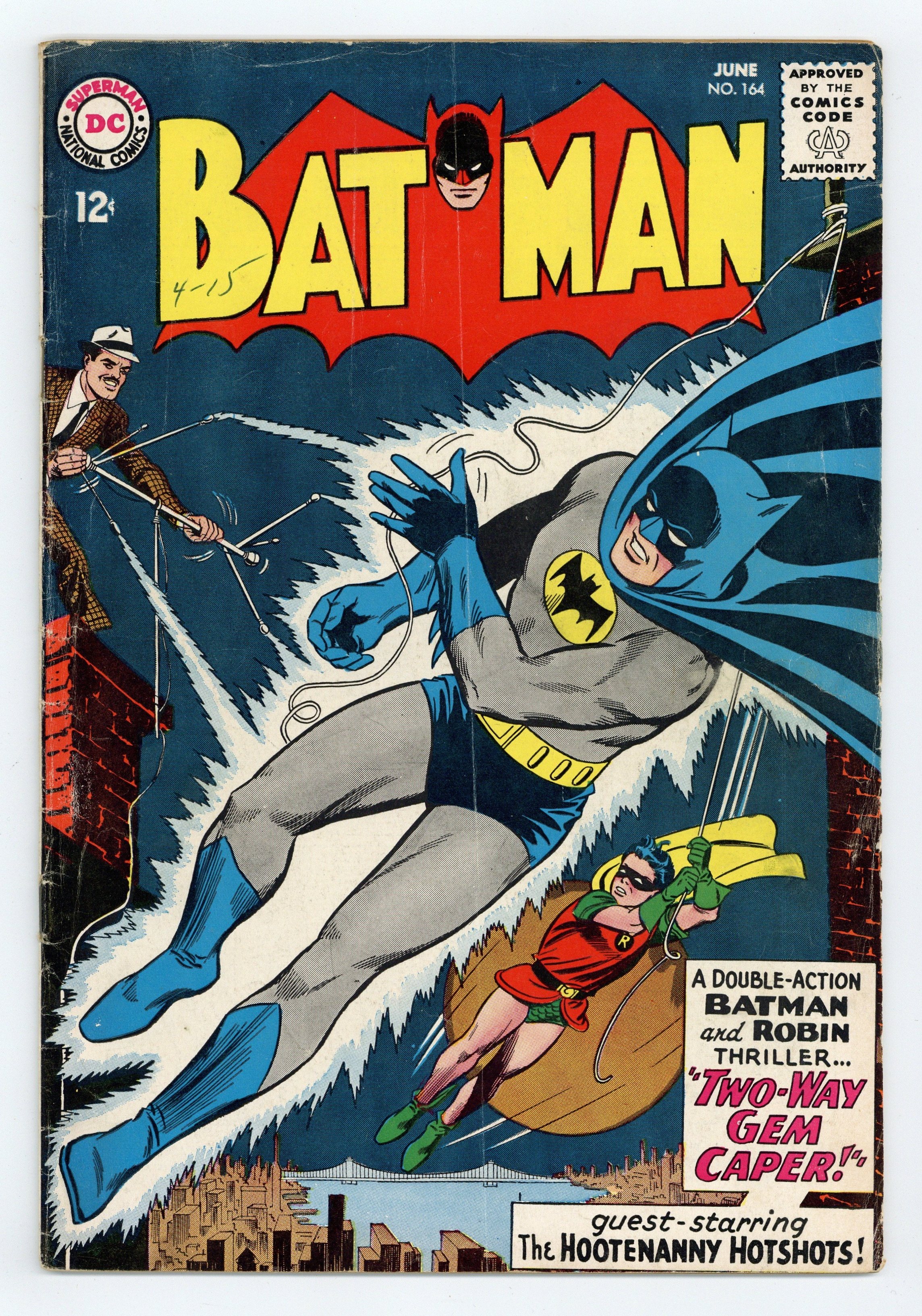 Cover pencils by Sheldon Moldoff, inks by Joe Giella. "Two-Way Gem Caper!", script by France Herron, pencils by Sheldon Moldoff (as Bob Kane), inks by Joe Giella; Batman discovers a plot to waylay a group of folk singers in order to perpetrate the theft of a pearl from a museum, and eventually nabs the villain after foiling a trap set for the criminal. "Batman's Great Face-Saving Feat!", script by France Herron, pencils by Sheldon Moldoff (as Bob Kane), inks by Joe Giella; A private investigator seeks to join the Mystery Analysts, but is blackballed by Batman for a very specific reason. Ancient Crime-Detection Methods! fact page. 36 Pages, Full Color. Cover price $0.12.