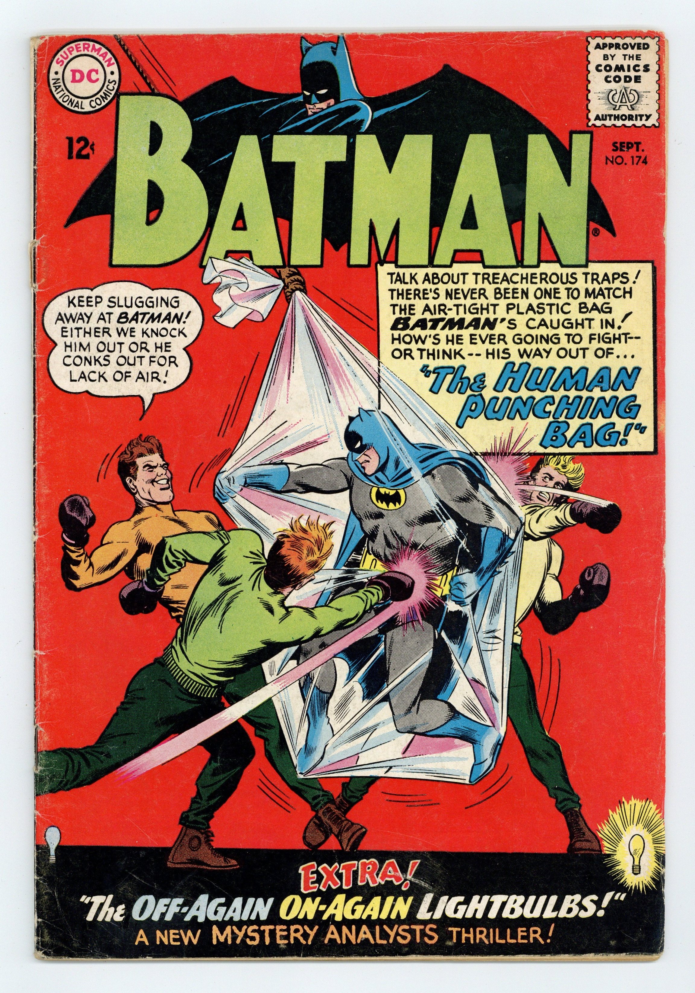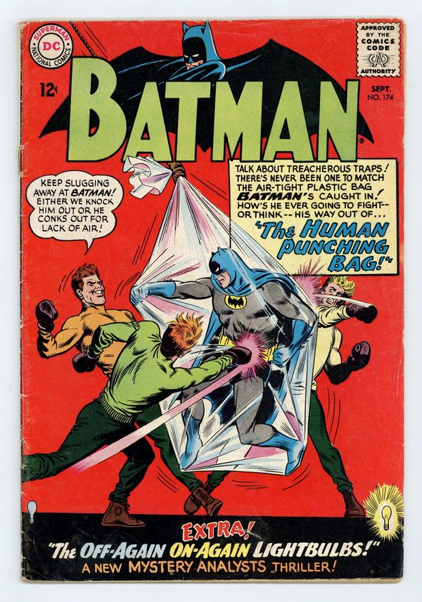 Cover pencils by Carmine Infantino, inks by Joe Giella. "The Human Punching Bag!", script by Gardner Fox, pencils by Sheldon Moldoff (as Bob Kane), inks by Joe Giella; Hunter breaks the Getaway Genius out of jail in order to provide a getaway gimmick, all the while planning a trap for the Batman. The Time of Death article. "Nature's Bill of Rights," script by Jack Schiff, art by Sheldon Moldoff; Two boys who are polluting a stream are given an anti-pollution lesson by a fisherman. "The Off-Again On-Again Lightbulbs!", script by Gardner Fox, pencils by Sheldon Moldoff (as Bob Kane), inks by Sid Greene; When Batman arrives at the Wednesday meeting of the Mystery Analysts, a cleaning man enters and announces that it is actually Friday, and he can prove it with a copy of that day's paper; Before anyone can question why, the cleaning man hypnotizes the group, not realizing the Batman is unaffected. Half-page Little Pete story by Henry Boltinoff. Rocky and Bullwinkle star in a one-page Cheerios ad. 36 Pages, Full Color. Cover price $0.12.