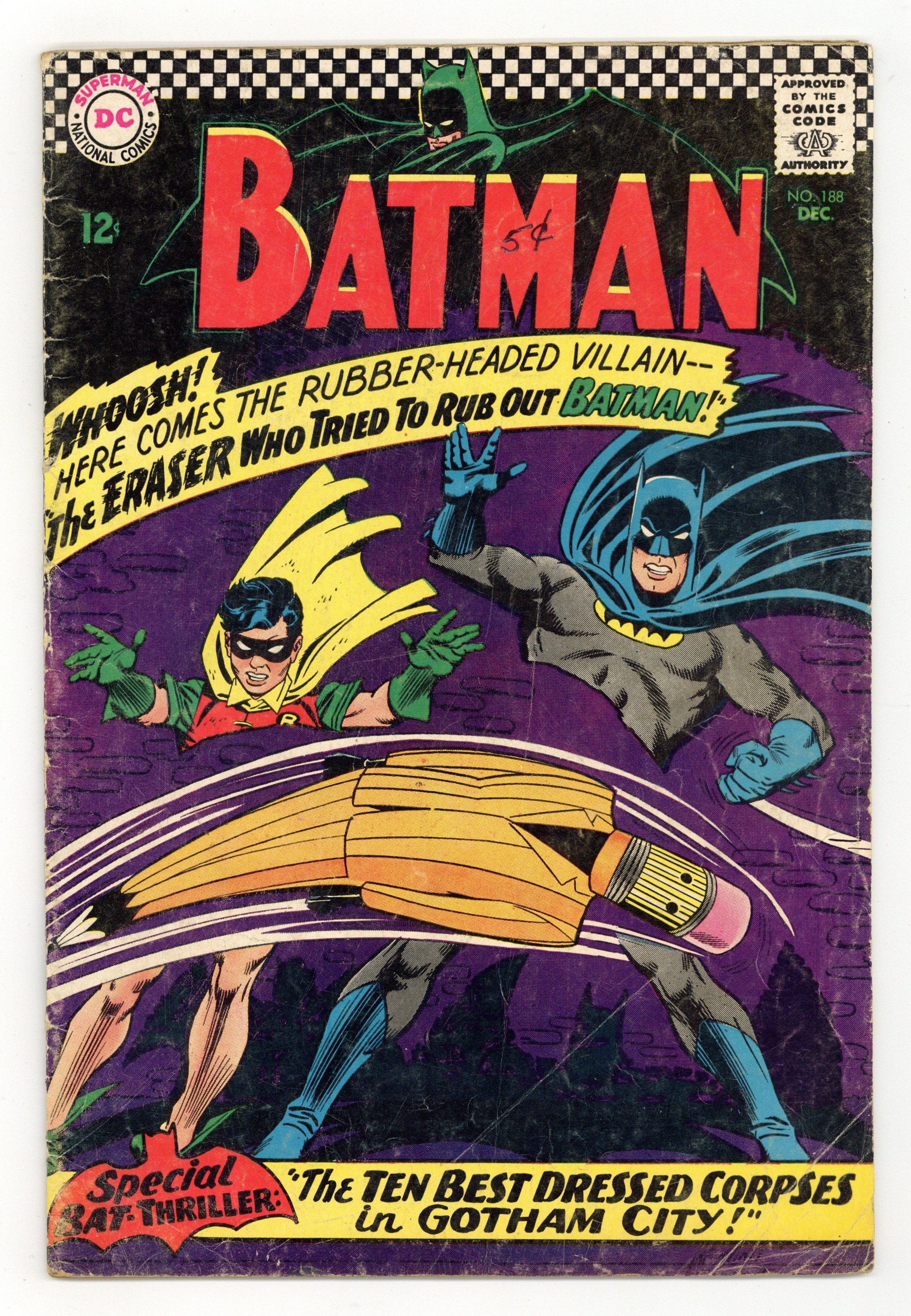 Cover pencils by Carmine Infantino, inks by Joe Giella. "The Eraser Who Tried to Rub Out Batman!", script by Robert Kanigher, pencils by Sheldon Moldoff (as Bob Kane), inks by Joe Giella; Commissioner Gordon gets Batman to investigate a series of crimes in which all of the clues have been erased, and the Caped Crusader goes undercover to do so. Cap's Hobby Hints activity half-page by Henry Boltinoff. "The Ten Best-Dressed Corpses in Gotham City!", script by John Broome, pencils by Sheldon Moldoff (as Bob Kane), inks by Sid Greene; A newspaper publisher calls in the Police and Batman, explaining to them that three of the men on his magazine's top-ten best dressed list have been murdered; Batman agrees to investigate and nearly dies himself as Bruce Wayne, who also was listed on the newspaper's listing. 36 Pages, Full Color. Cover price $0.12.